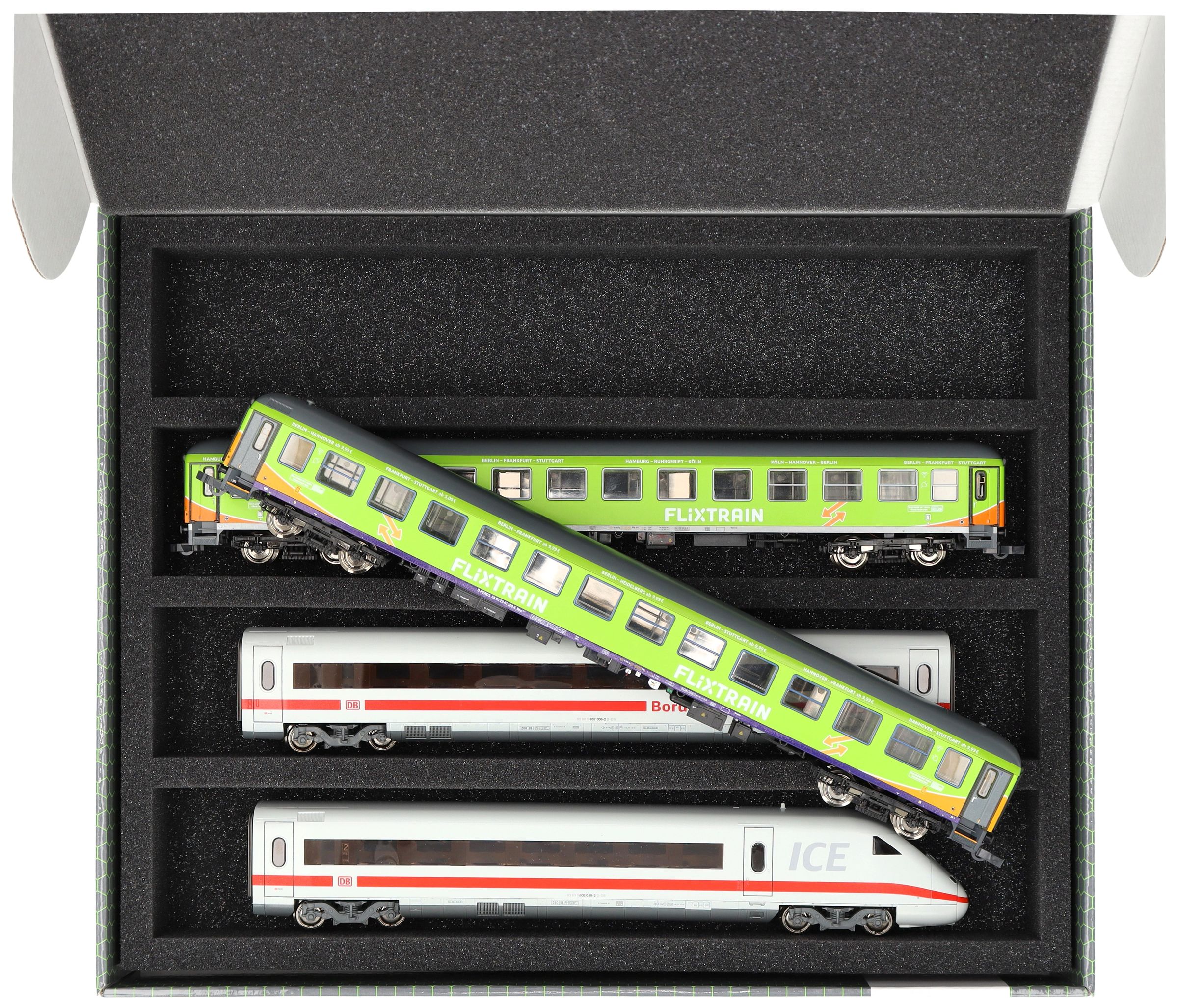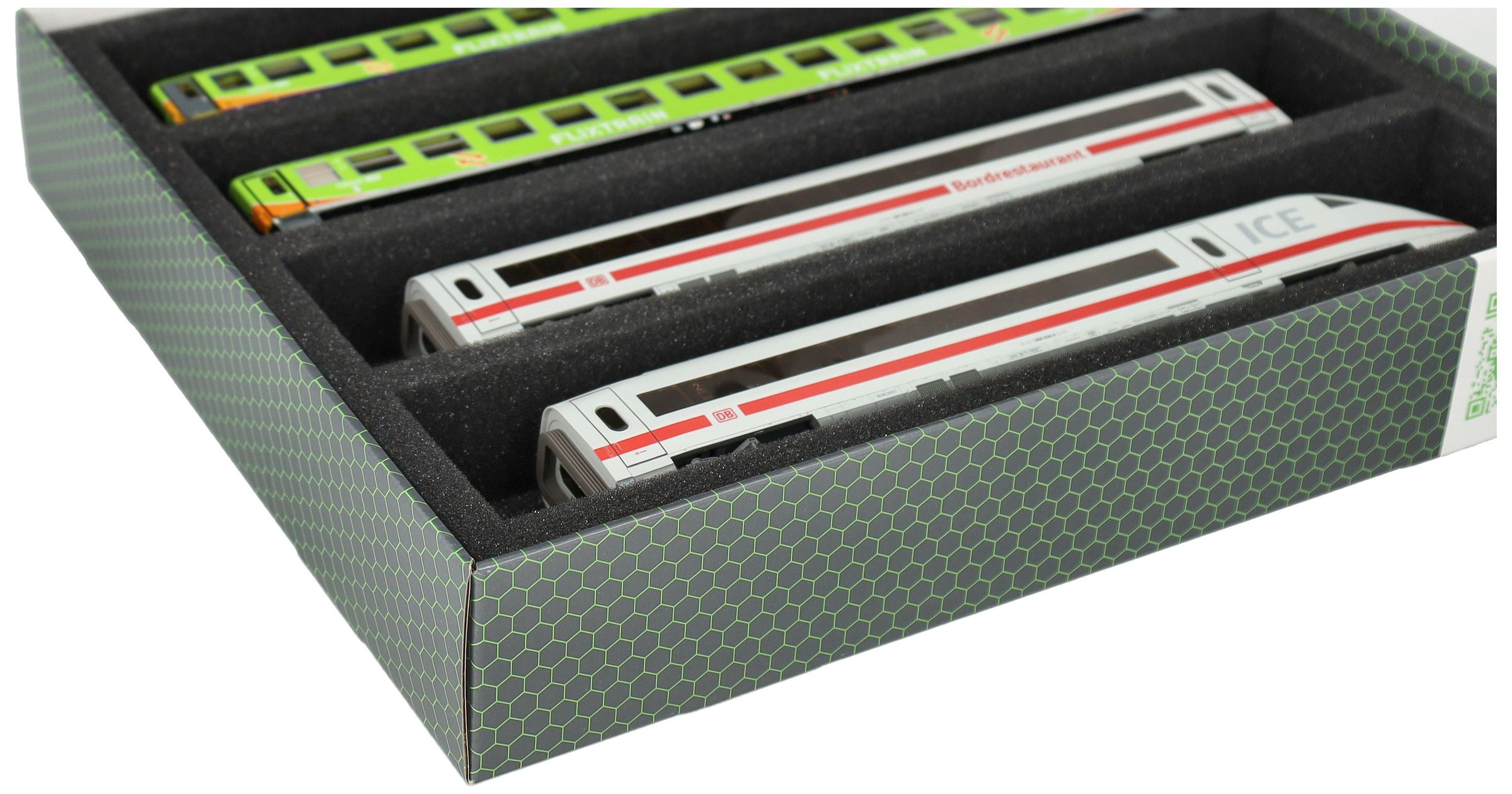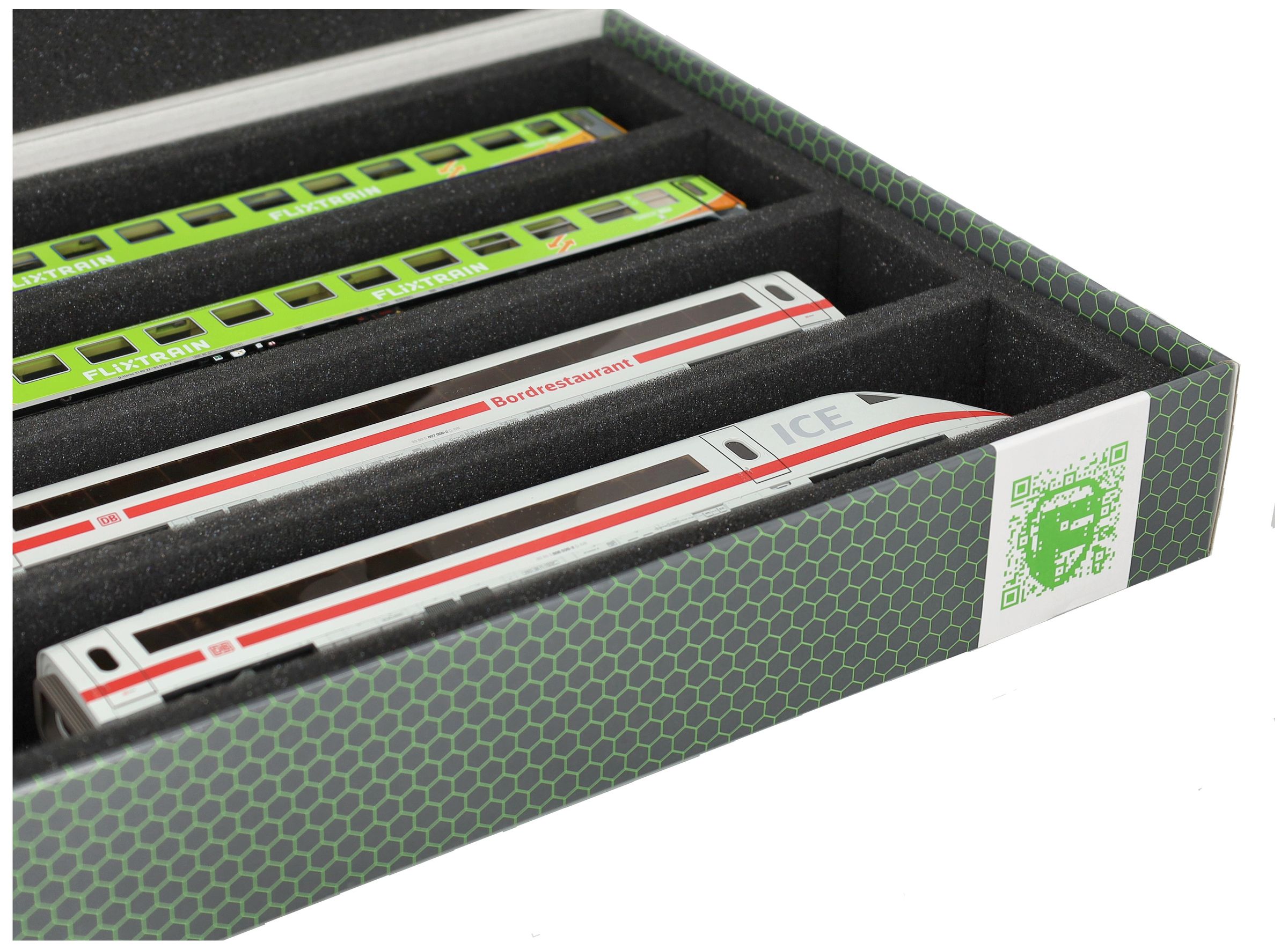 Several trains and carriages can be stored next to each other in one compartment. In order to prevent collision or unintentional coupling, we offer suitable foam spacers (HS040A002, HS020A001) to separate your vehicles.