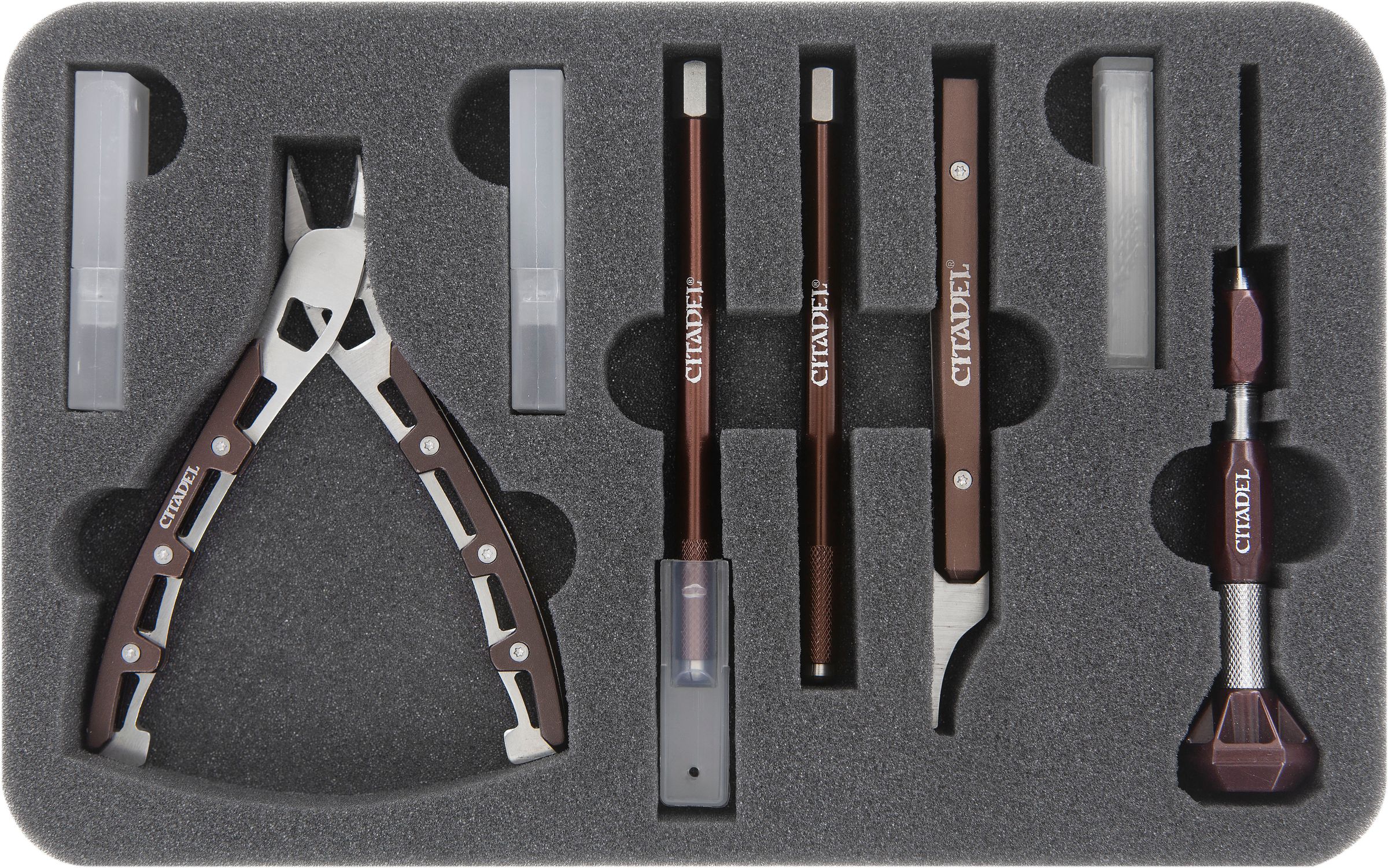 The tray for the Citadel tools has 5 custom compartments for the following GamesWorkshop tools: