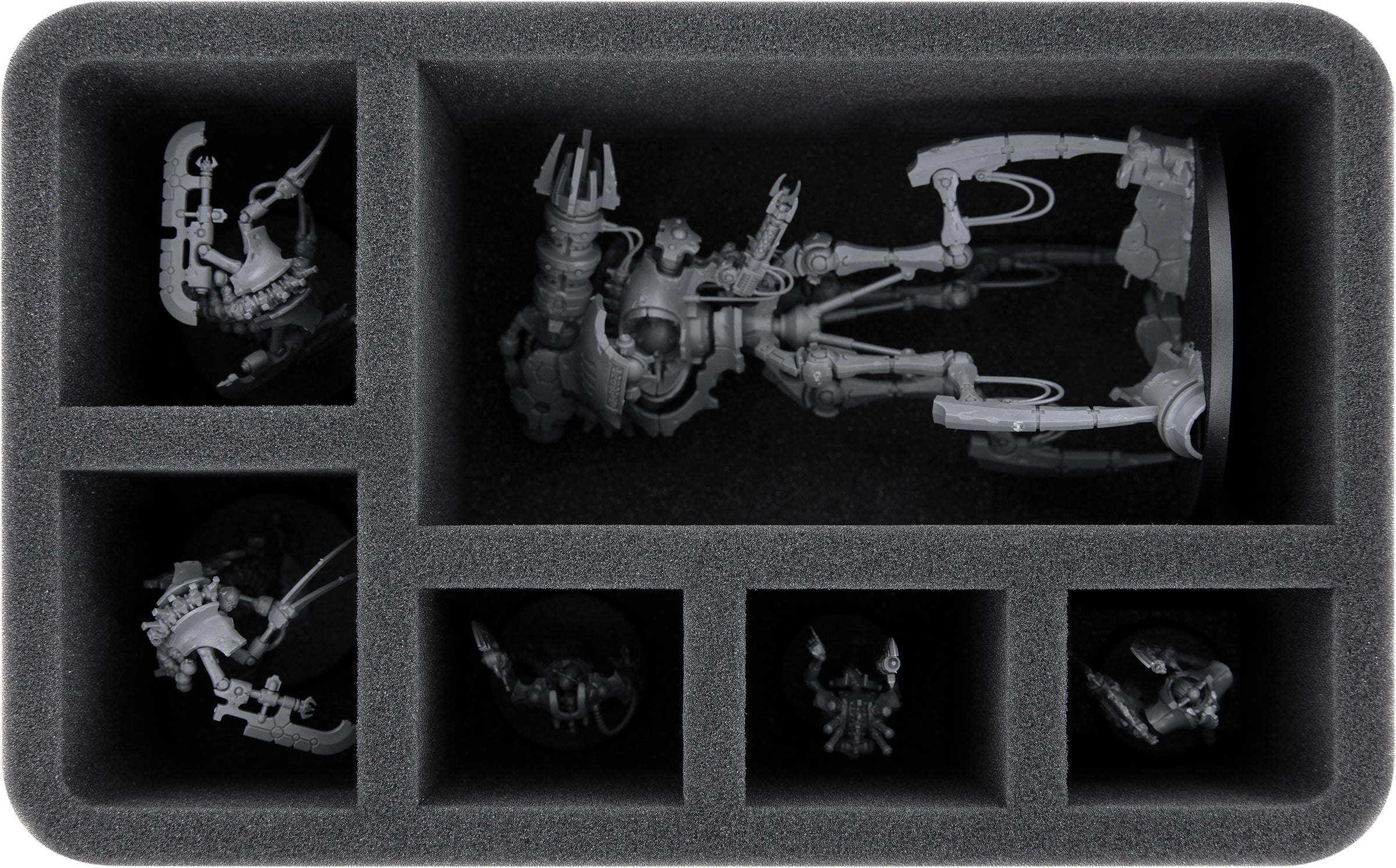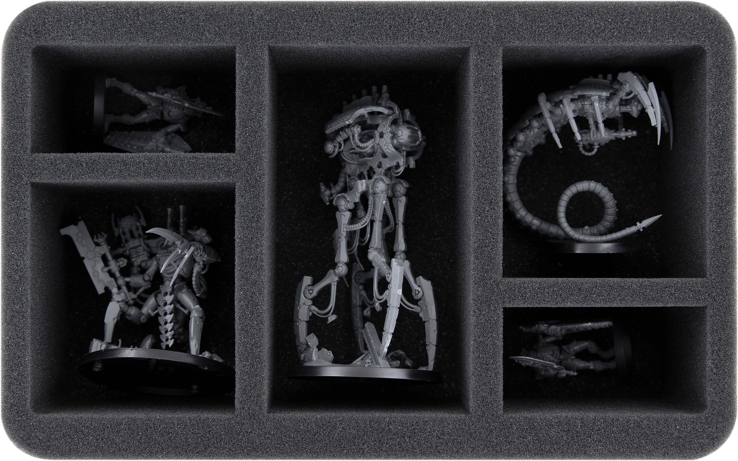 In the Feldherr Half-Size foam tray with five compartments various units of the Necrons find a safe shelter. The different sized compartments are ideal for storing both larger miniatures such as a Canoptek Reanimator and standard models like Necrons Warriors neatly and well protected.