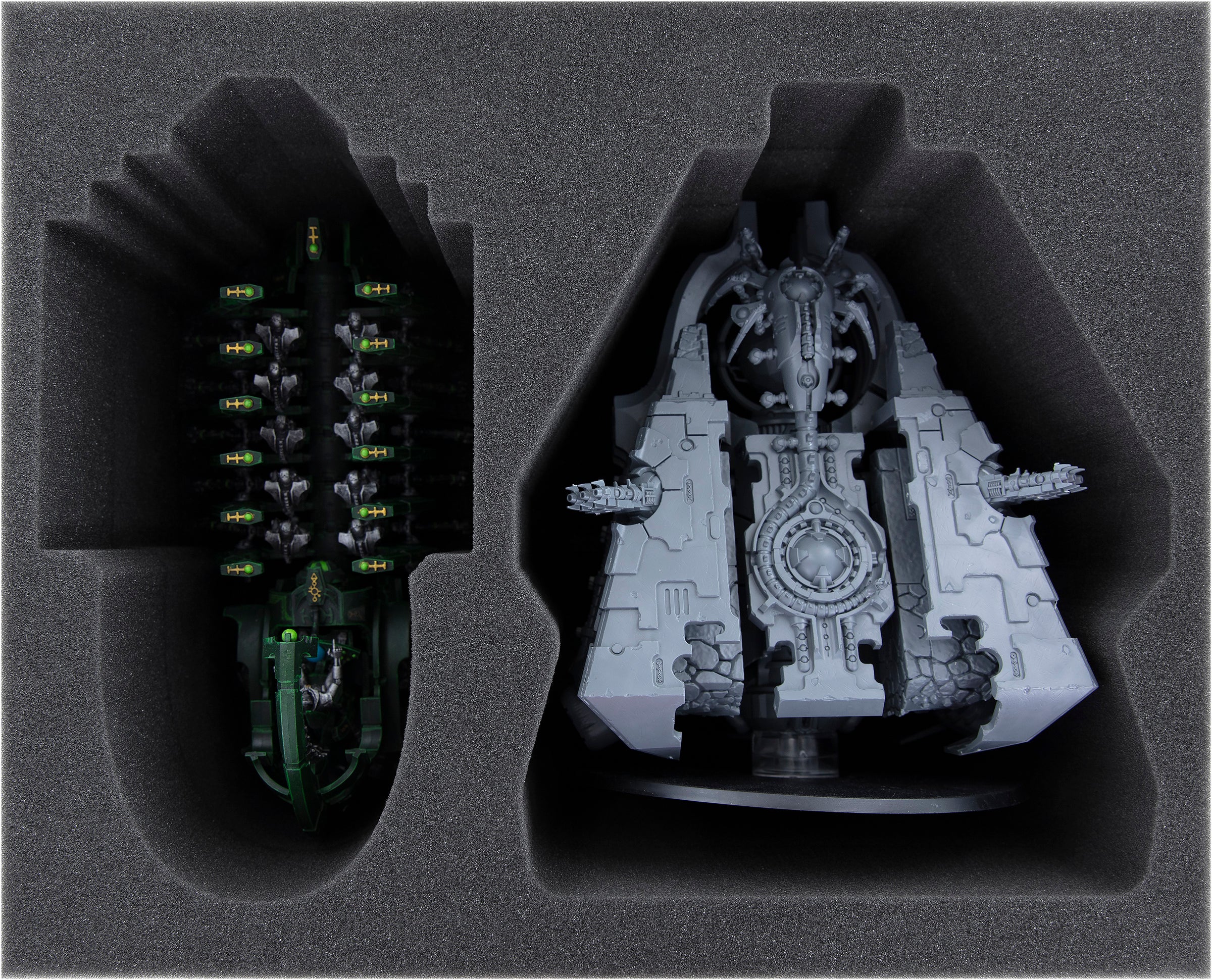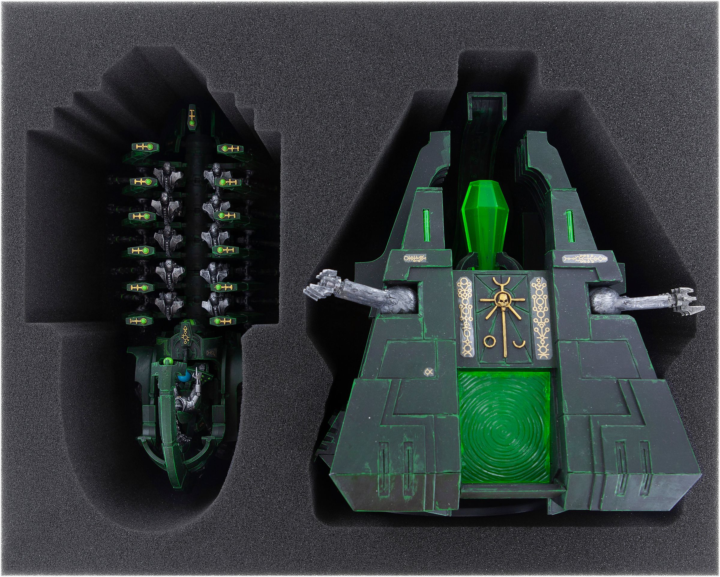 One compartment is custom-cut to the Monolith miniature of the necrons. It fits with and without base. Completely wrapped in high-quality, soft foam, the sensitive details, such as the Gauss flux Arcs, are just as well protected against damage and scratches as the colors and transfers of the finished colored miniature.