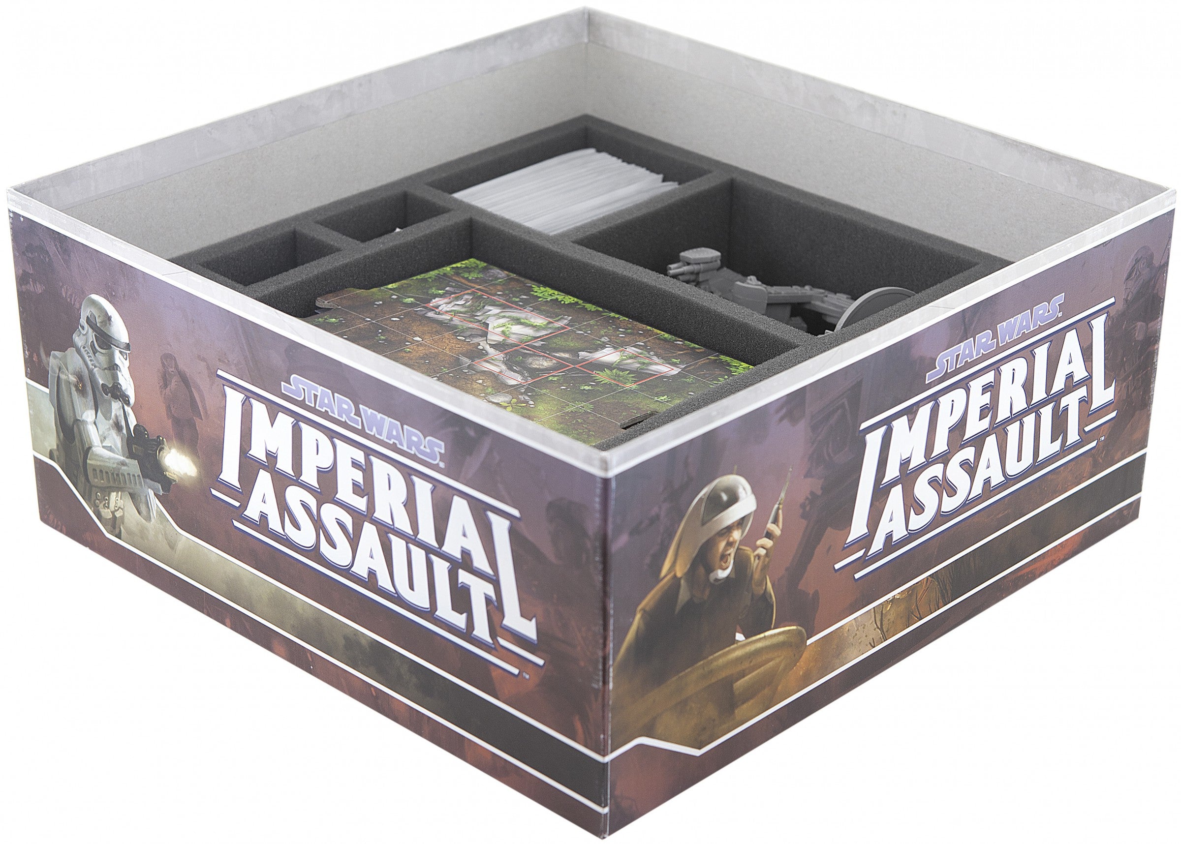 Questo inserto in schiuma si inserisce perfettamente nella scatola originale dei giochi da tavolo di Star Wars Imperial Assault. In 10 slot inserire il modello AT-ST, il pavimento, piastrelle, carte, pennarello e gettone. Tutte le miniature del gioco sono chiaramente disposte e imbottite.