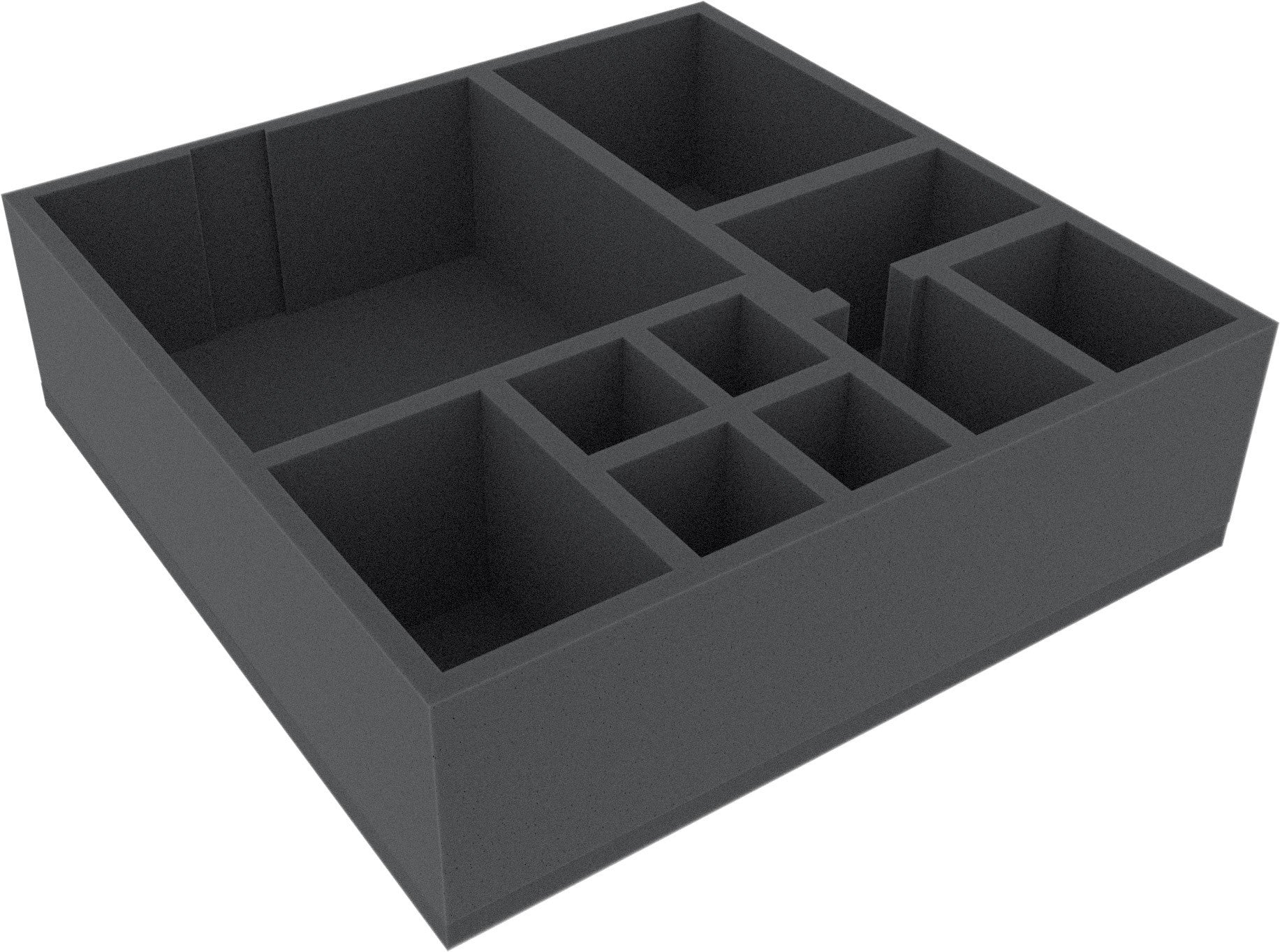 Le dimensioni di questo vassoio di schiuma per giochi da tavolo sono 285 mm x 285 mm x 85 mm. Lo spessore di 85 mm è il risultato di una base di 10 mm e di un vassoio con un'altezza utile effettiva di 75 mm. Pronto all'uso - base in schiuma 10 mm incollata.