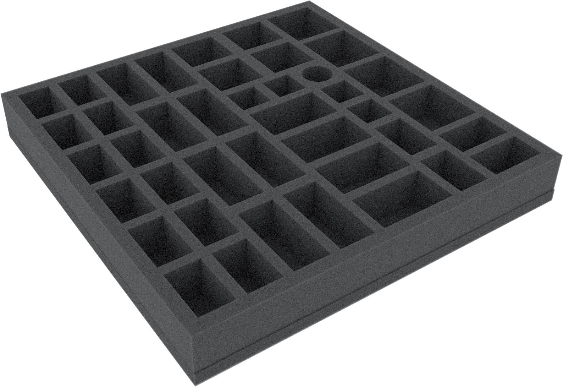 Foam tray especially for Blood Rage expansions. The 41 different sized compartments are suitable for the miniatures from the expansions 5th player, Gods of Asgard and Mystics of Midgard.