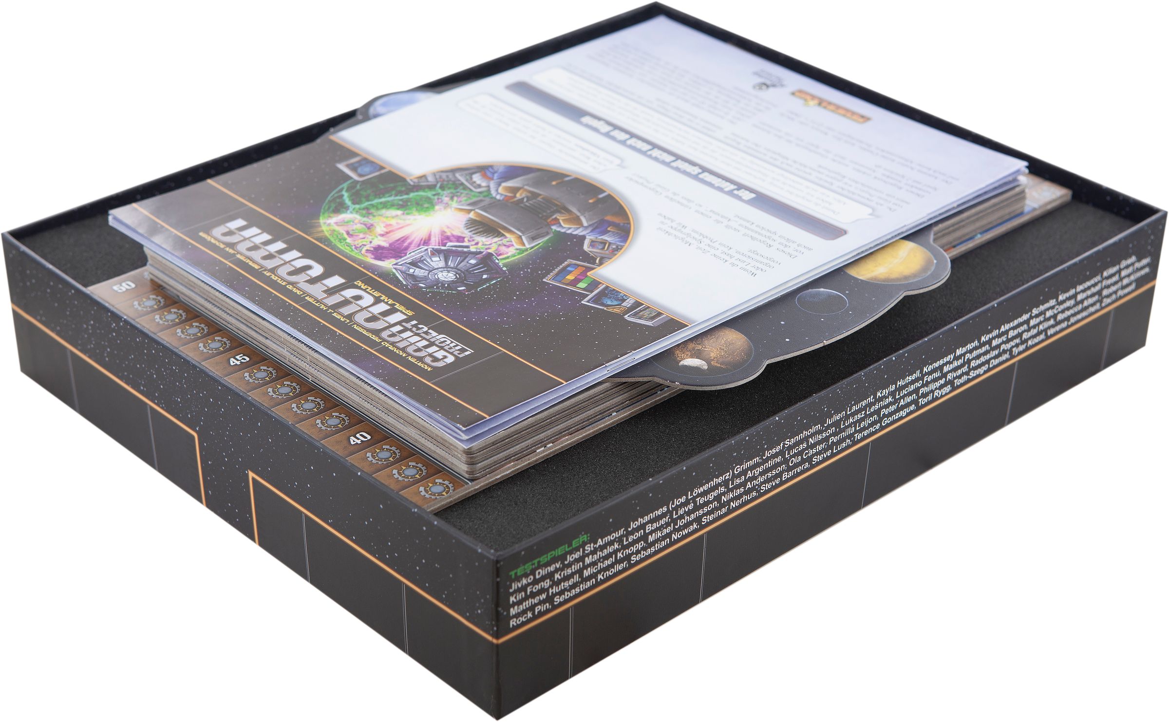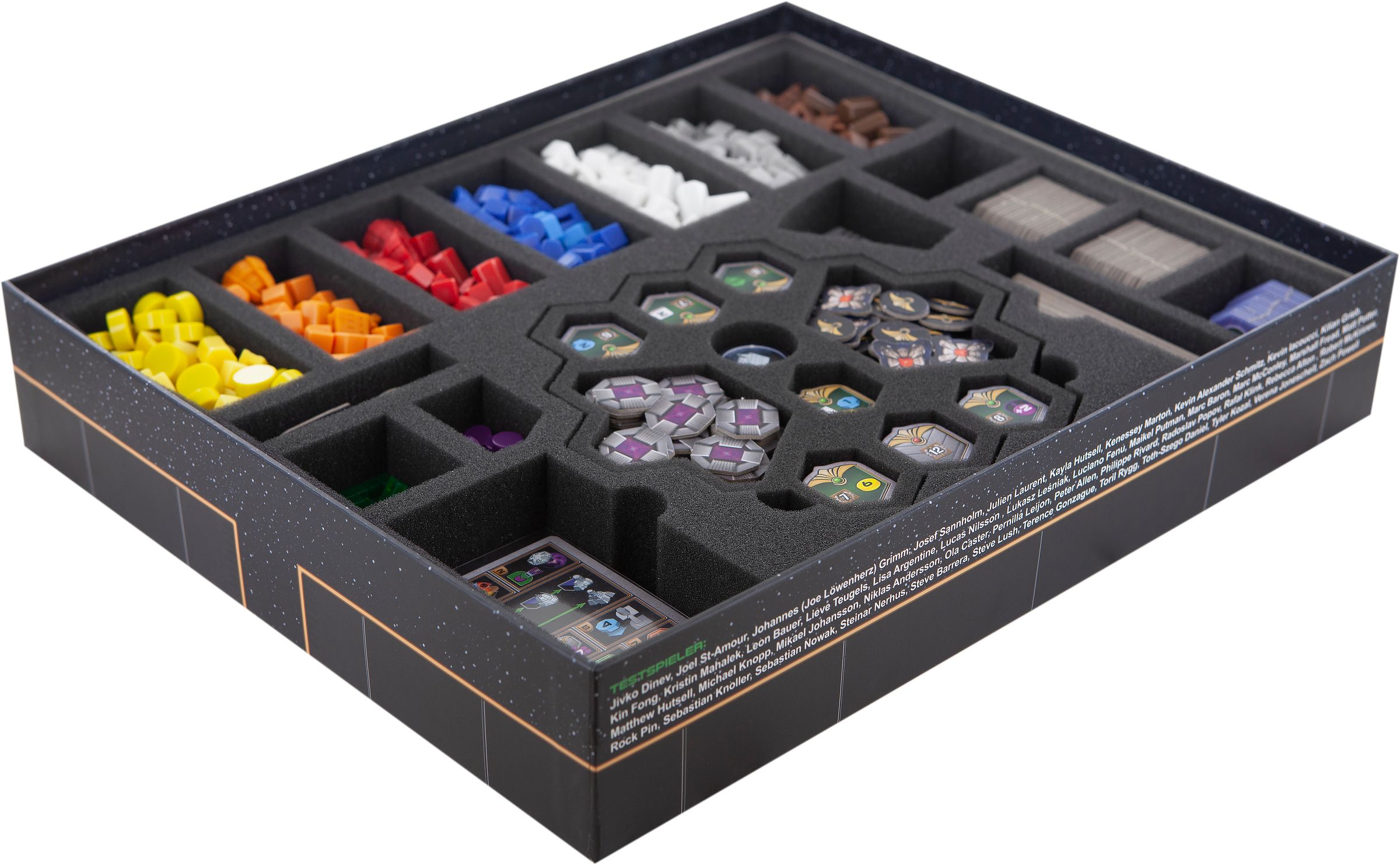 The extra-compartment for the removable insert has the same base area as the space sector tiles and features 10 compartments. The 10 compartments provide space for federation tokens, action tokens and record tokens.