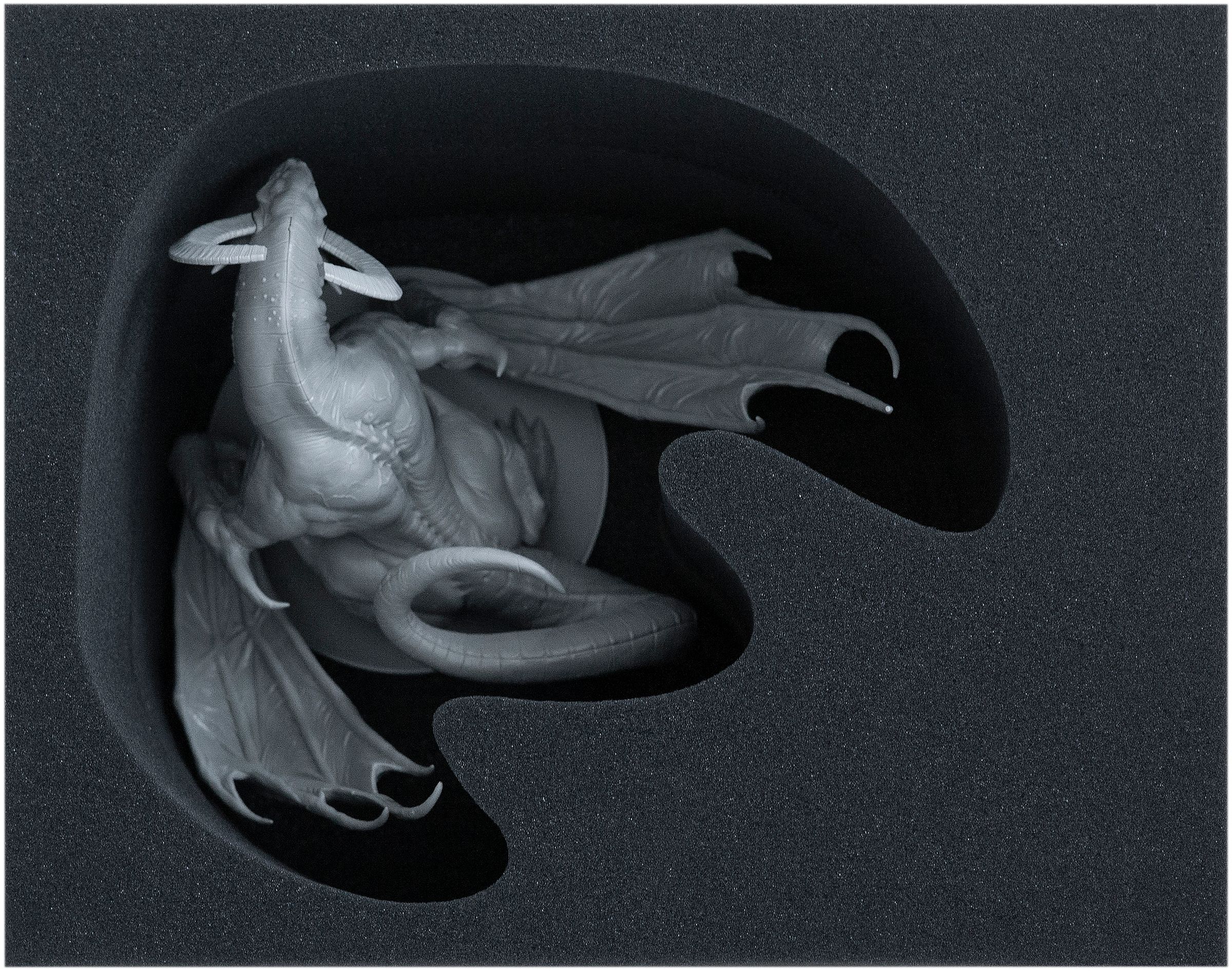 The Set, which provides a safe space for the exclusive miniature, consists of two stackable foam trays and one foam topper. The lower tray features a custom cut compartment for the Dragon King and two additional compartments for smaller KDM 1.5 + 1.6 miniatures like e.g. Flower Knight. This tray comes with a 10 mm base.