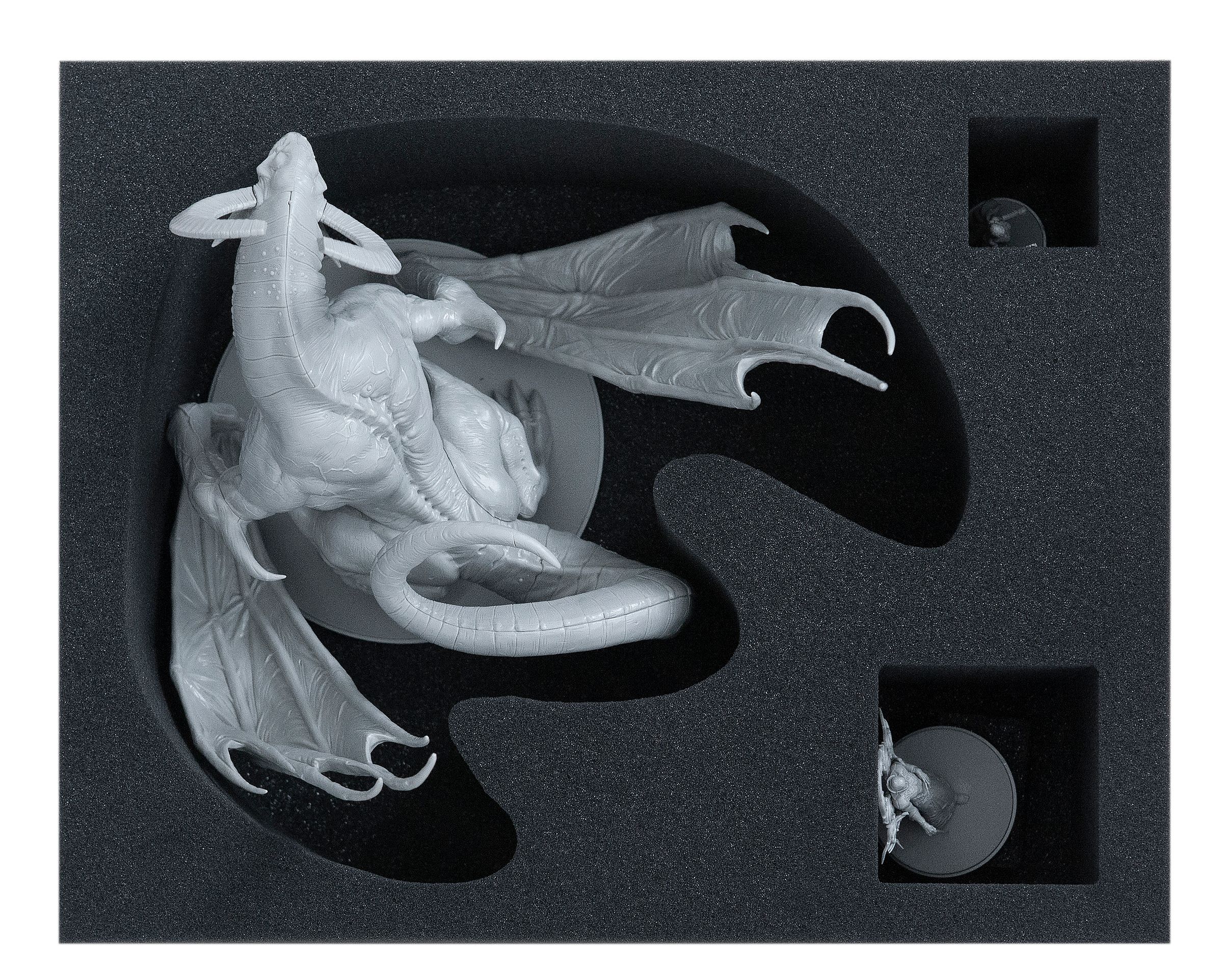 As soon as you have filled the lower tray with your figures, you stack the upper tray, which has a special cut-out for the Dragon King, on top. The smaller minis are thus covered and the Dragon King is well protected. The foam topper that comes with the Set can then be placed on top of the upper tray to provide additional protection.
