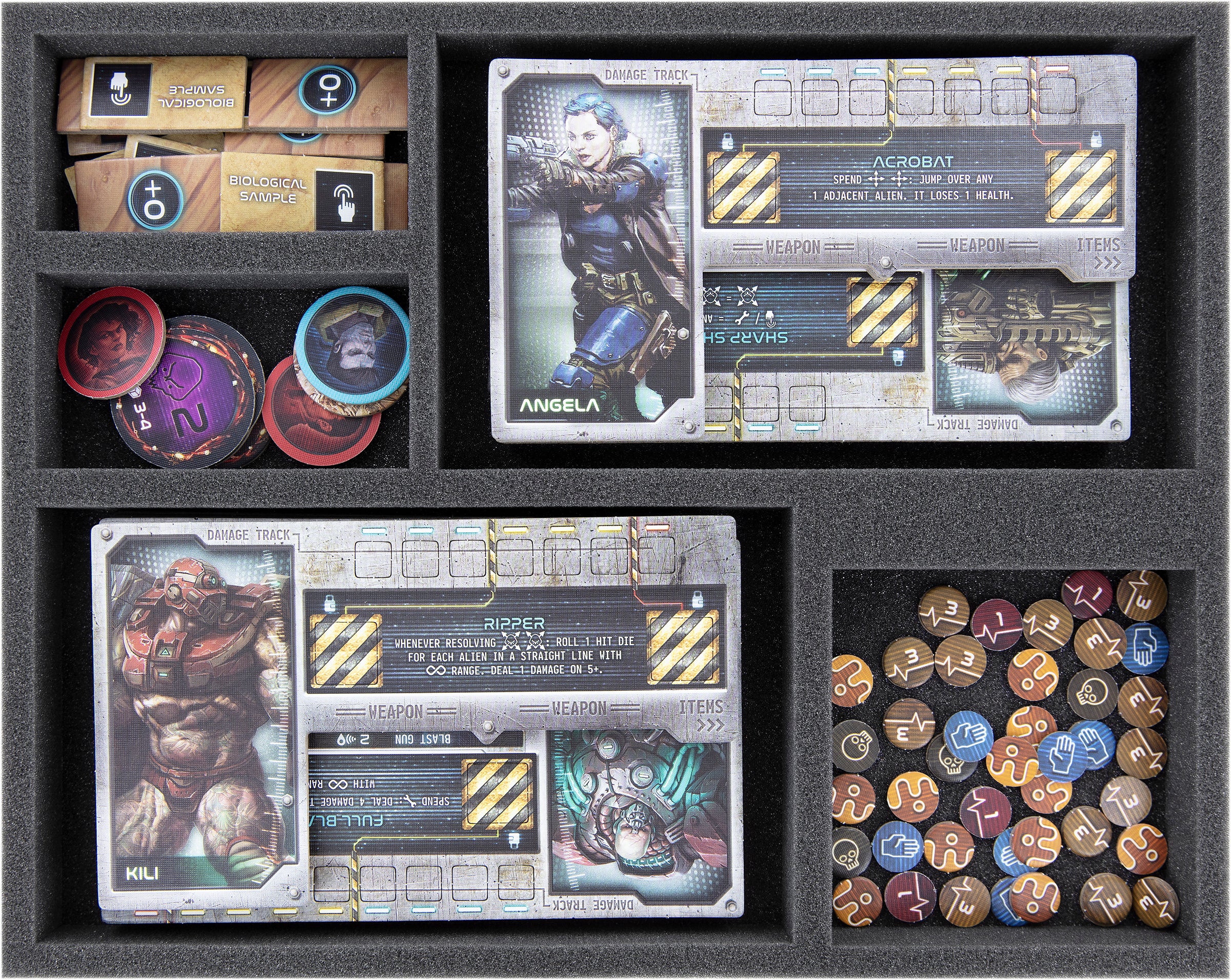 Individual inserts with special compartments for cards, dice, tiles, and tokens help you to keep your game material always compact, organized, and safe. You keep track of your game materials, save time when setting up the game and can concentrate on the important things of life: load, aim, fire, and collect alien scalps. Always remember: The only good alien is a dead alien.