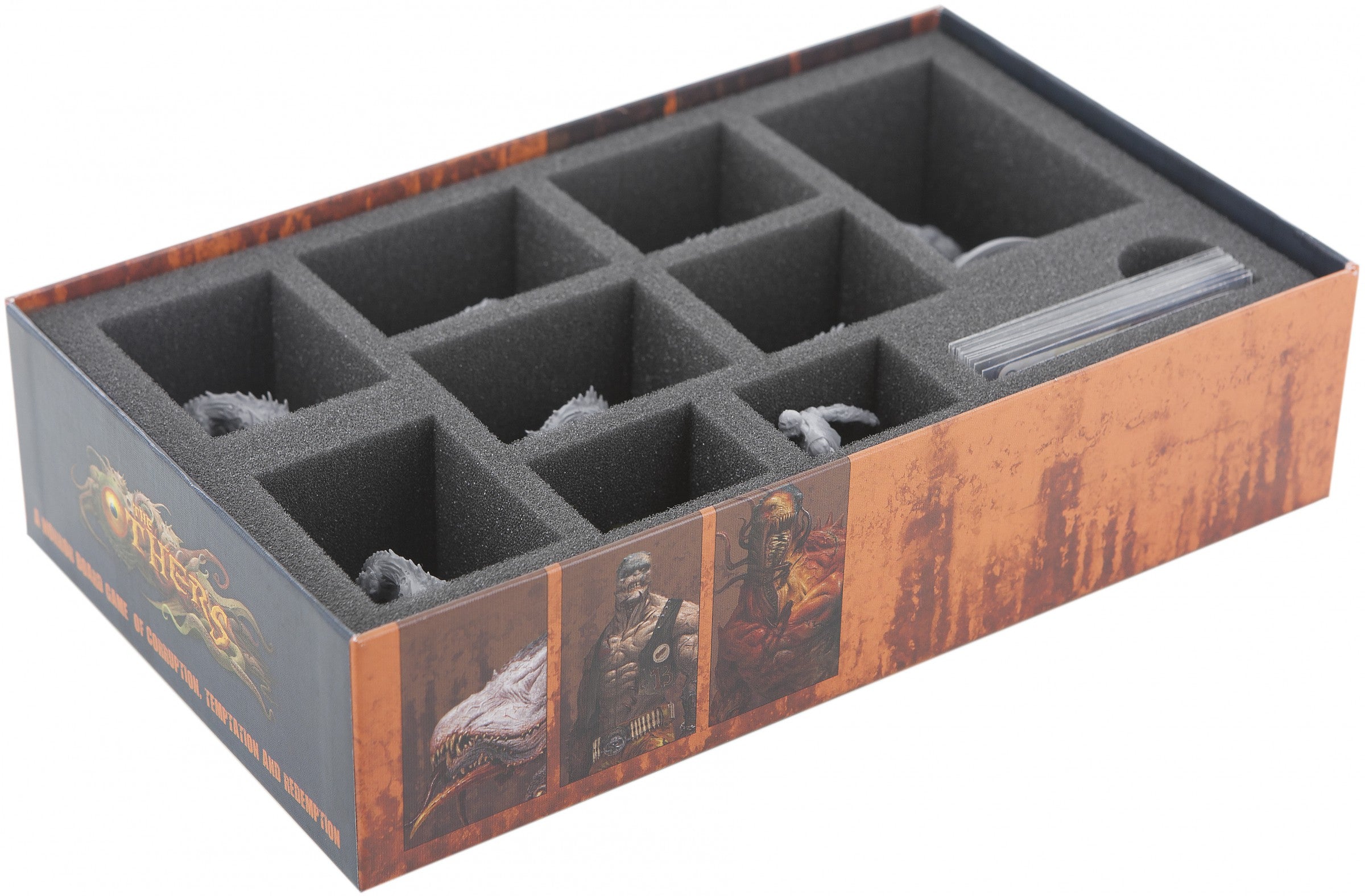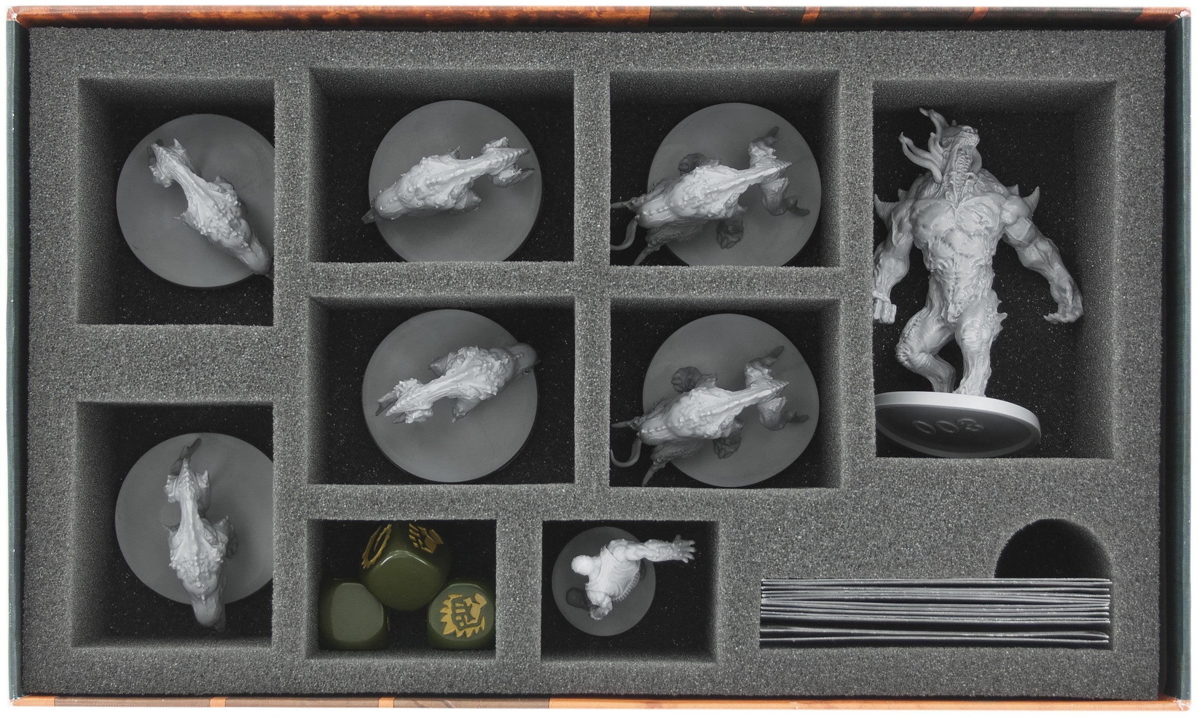 Foam insert for the small Sin box. The insert is 238 mm x 140 mm x 55 mm and comes with a matching topper. There is enough space for 6 Abominations, 1 Avatar and 1 Comtroller, as well as the cards (with or without sleeves) and accessories.
