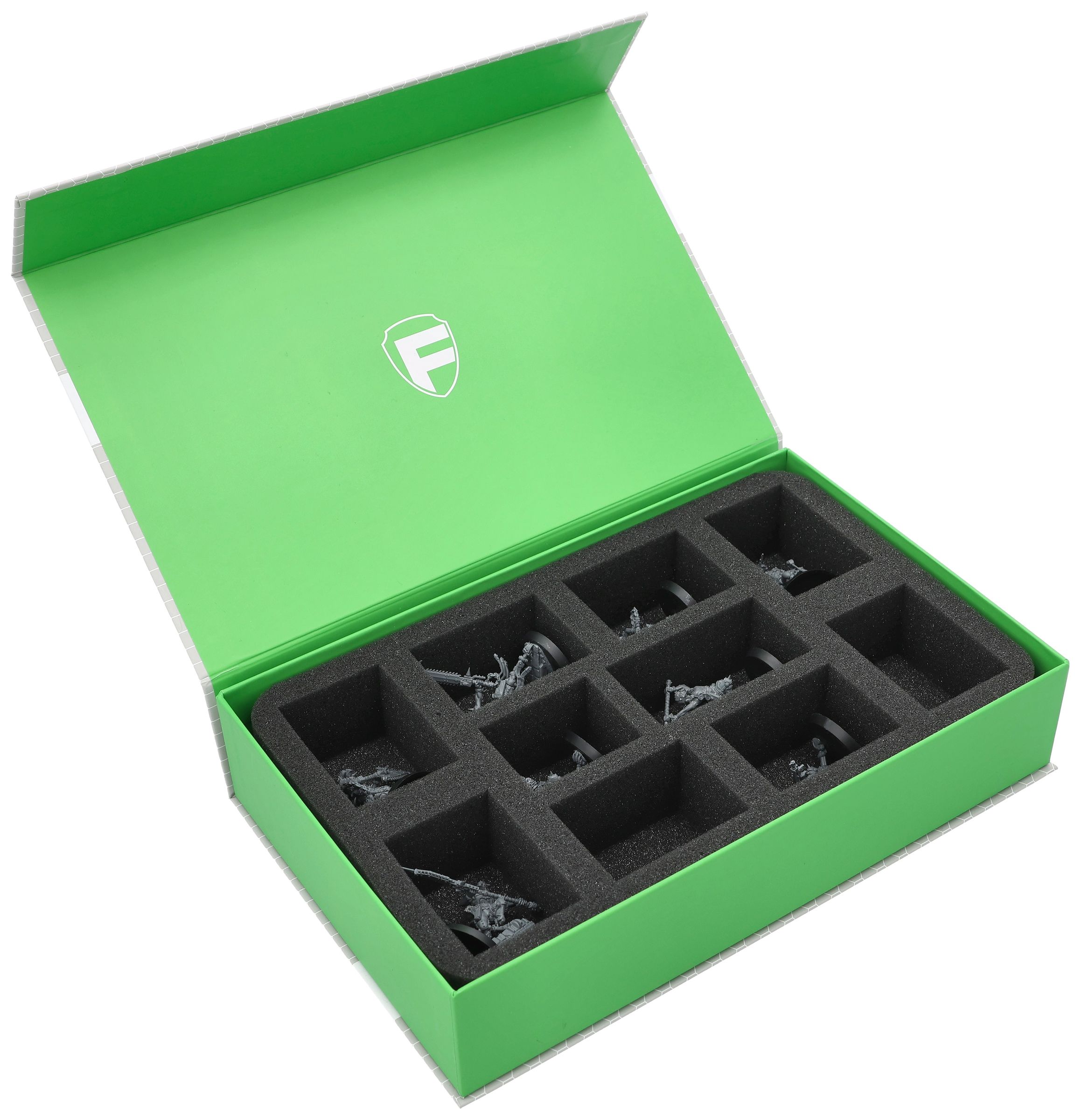 This sturdy green Magnetic Box with custom-fit Feldherr foam insert provides the perfect protection for your Goremongers from the Kill Team: Blood and Zeal Force Starter Set.
