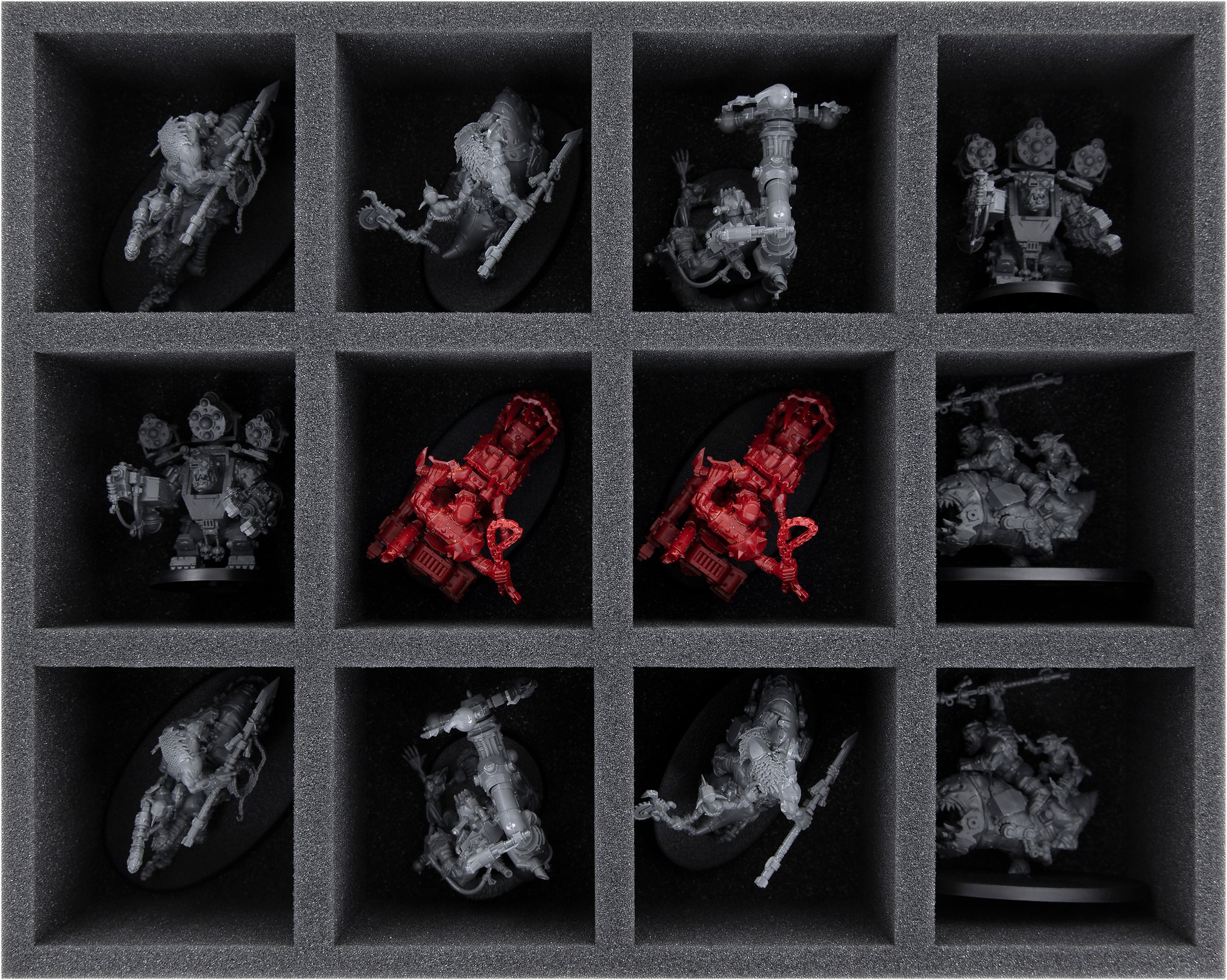 On this Feldherr foam tray you have space for up to 12 miniatures of your army. The insert is especially suitable for storing the Squighog Boyz, Big Mek with Shokk Attack Gun, Big Mek in Mega Armour and similar sized models.