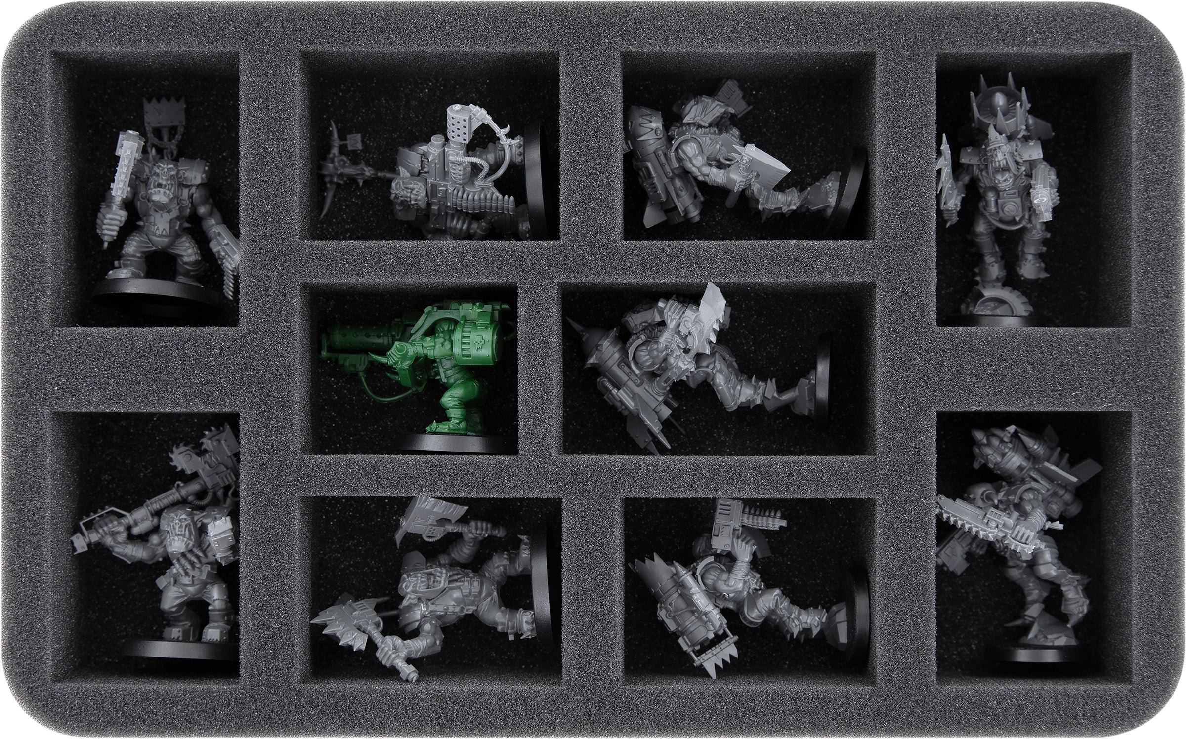 On this Feldherr foam tray you have space for up to 10 miniatures of your army. The insert is especially suitable for storing the Ork Boyz, Lootas, Stormboyz and similar sized models.