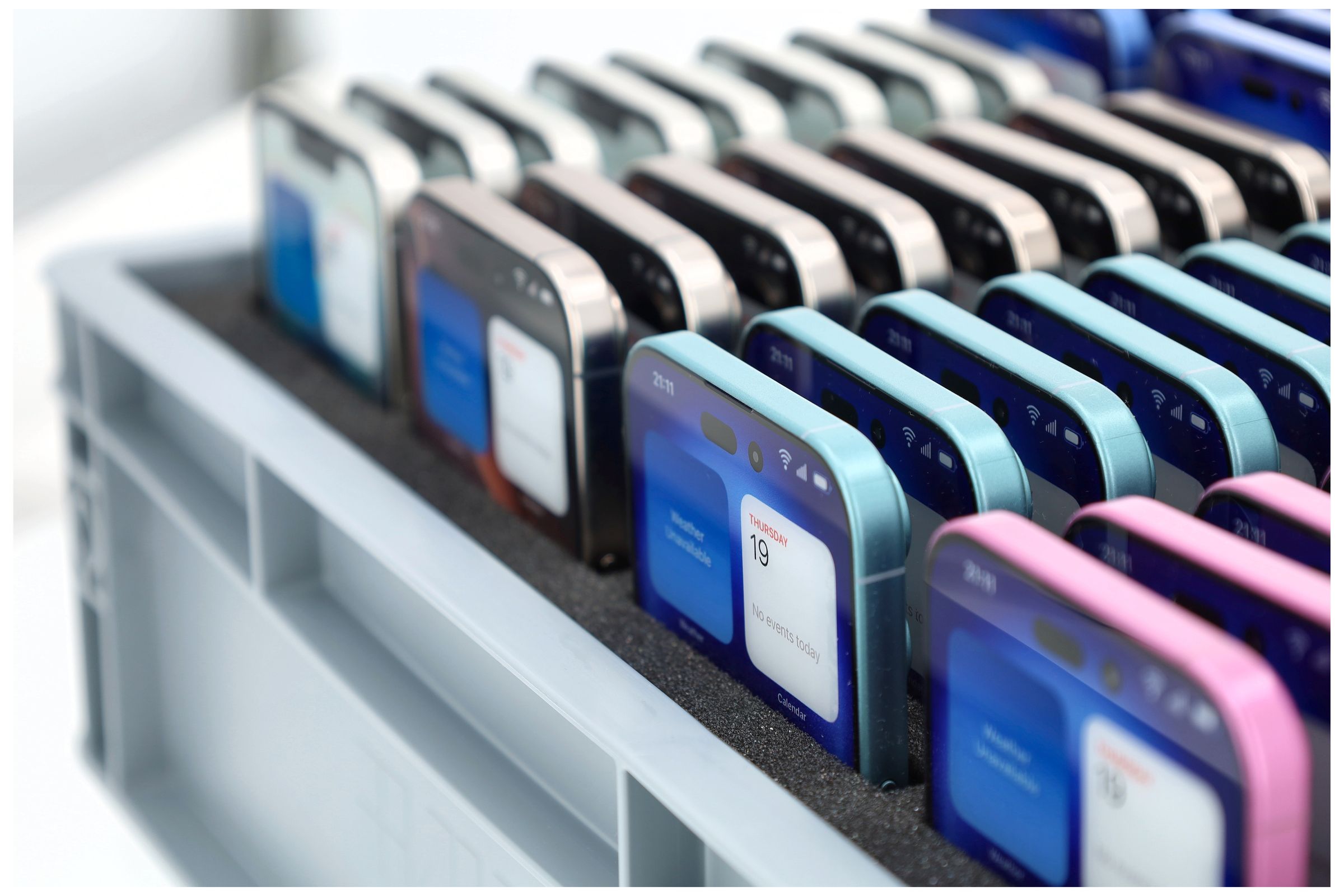 Our robust smartphone storage box is the ideal solution for secure and organized cell phone storage in classrooms. The sturdy box, measuring 40 cm x 30 cm x 12 cm, features a custom foam insert accommodating up to 48 smartphones, creating a central cell phone parking station for the entire class.