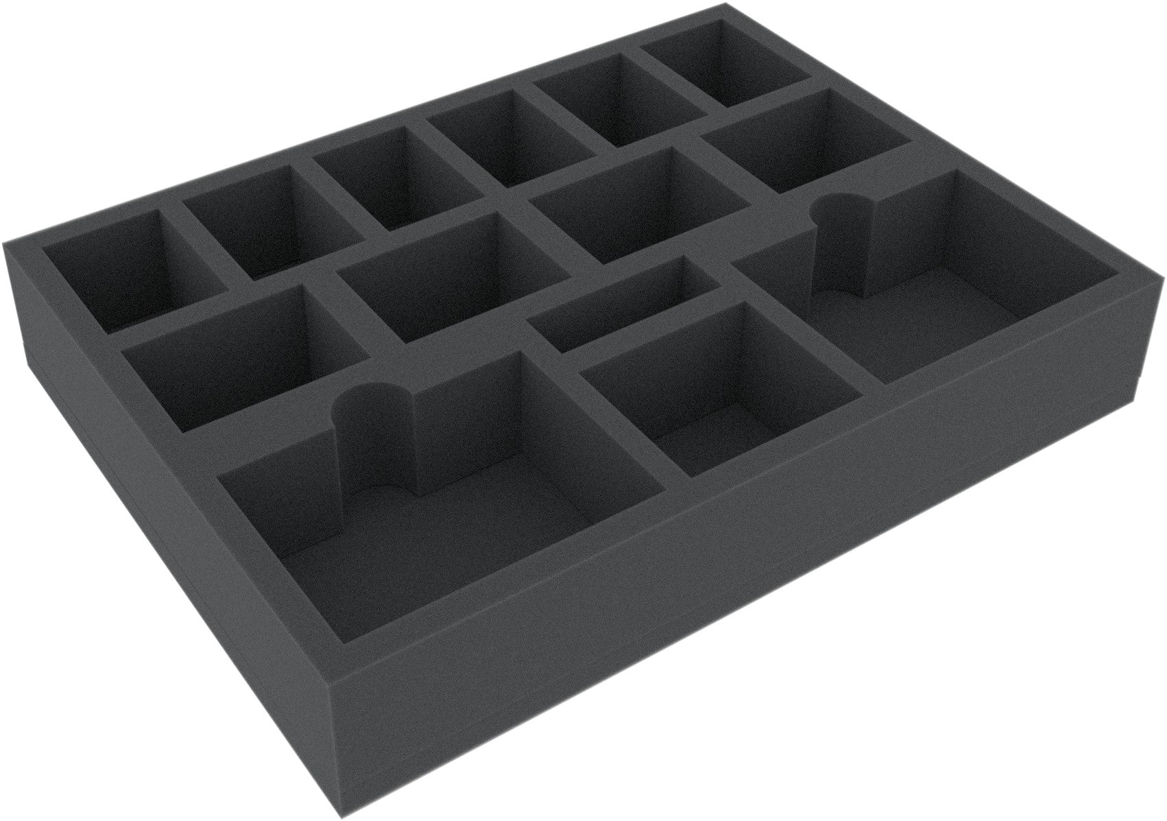 This 50 mm high foam tray is divided into 14 compartments. It is particularly suitable for the safe storage of tabletop and board game miniatures, as well as other fragile models and small parts.