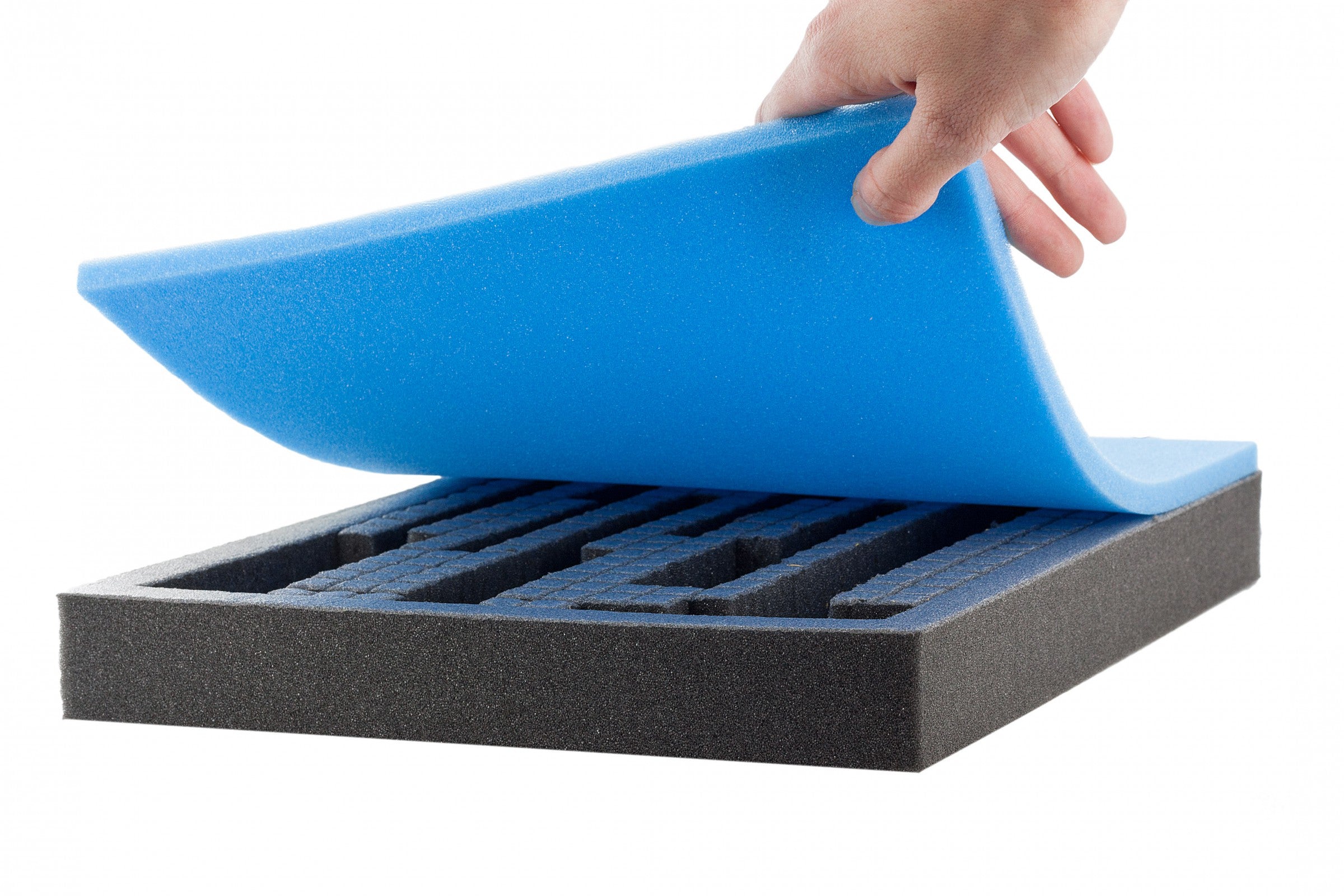 Le immagini mostrano un esempio di una possibile applicazione di schiuma colorata FS010 insieme ad un inserto in schiuma grigliata da 25 mm autoadesiva (le schiume grigliate sono disponibili separatamente da noi e non incluse in questo set!). Dimensioni: 345 mm x 275 mm x 10 mm