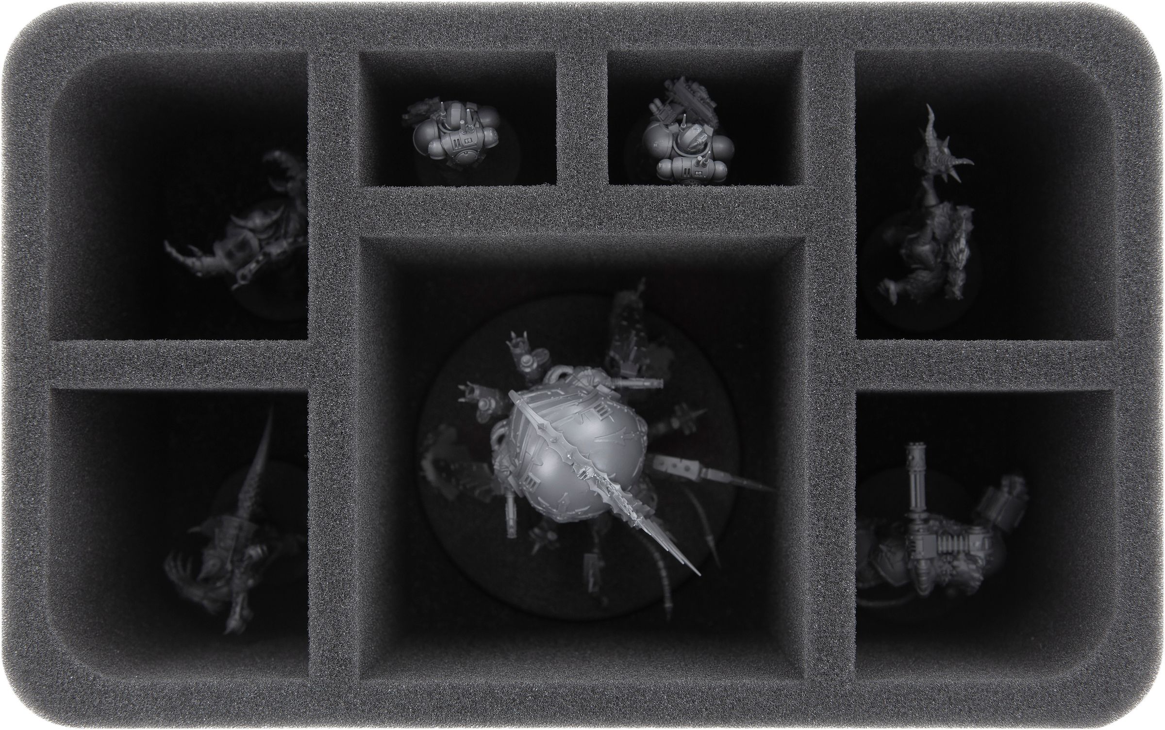 The Venomcrawler is padded softly on the 110 mm high foam tray. It has the large compartment in the middle. The precisely fitting cut ensures that the miniature remains securely in place during transport. With the soft foam not only the many filigree details are best protected from damage, the colors of the painted model are also spared from abrasion and scratches.