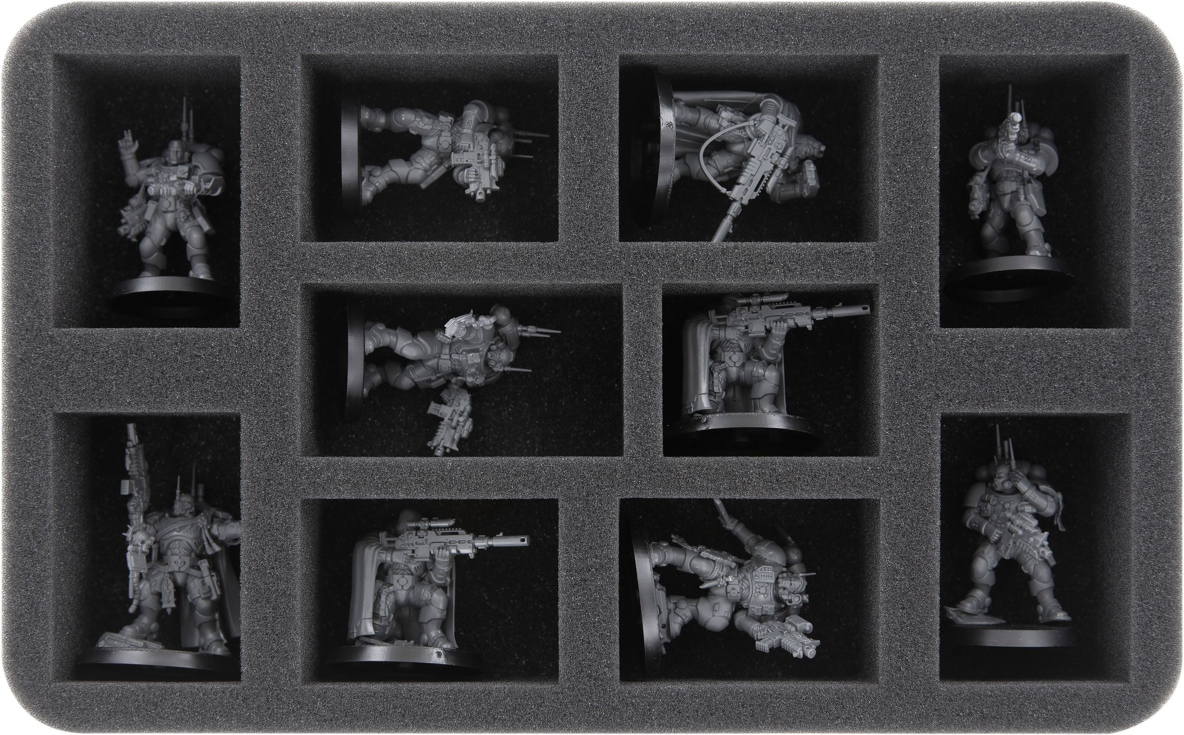 <For the remaining Battle Brothers of your Vanguard - the Captain, the Lieutenant, the Eliminators and the ten Infiltrators - there are two more inserts in which each miniature finds its place. Here as well, five compartments stay free for further figures or accessories.
