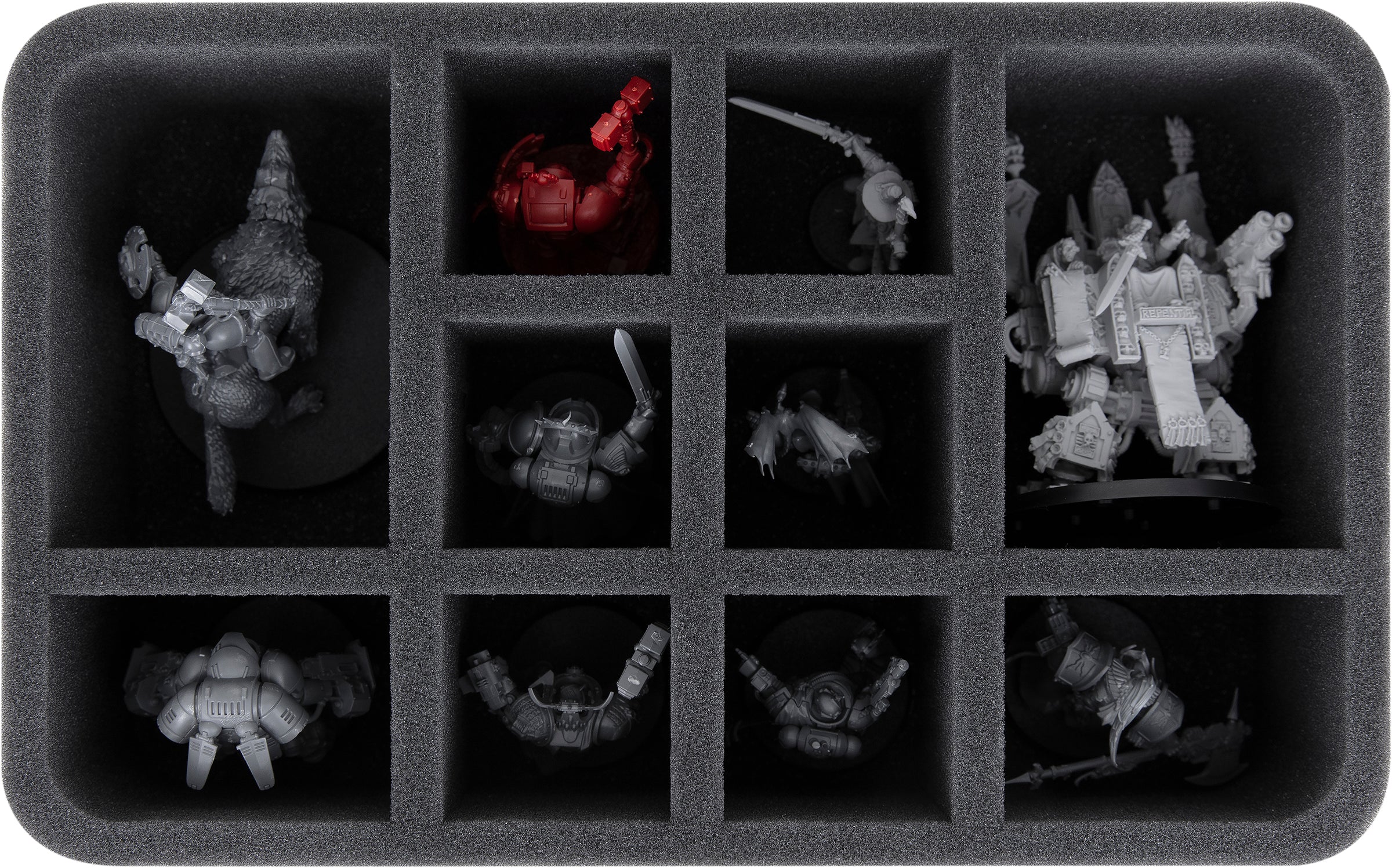 This Half-Size foam tray is divided into 10 compartments to safely store and transport your units. It is particularly suitable for Primaris Invader ATV, Terminators, Primaris Space Marines or similar sized miniatures.