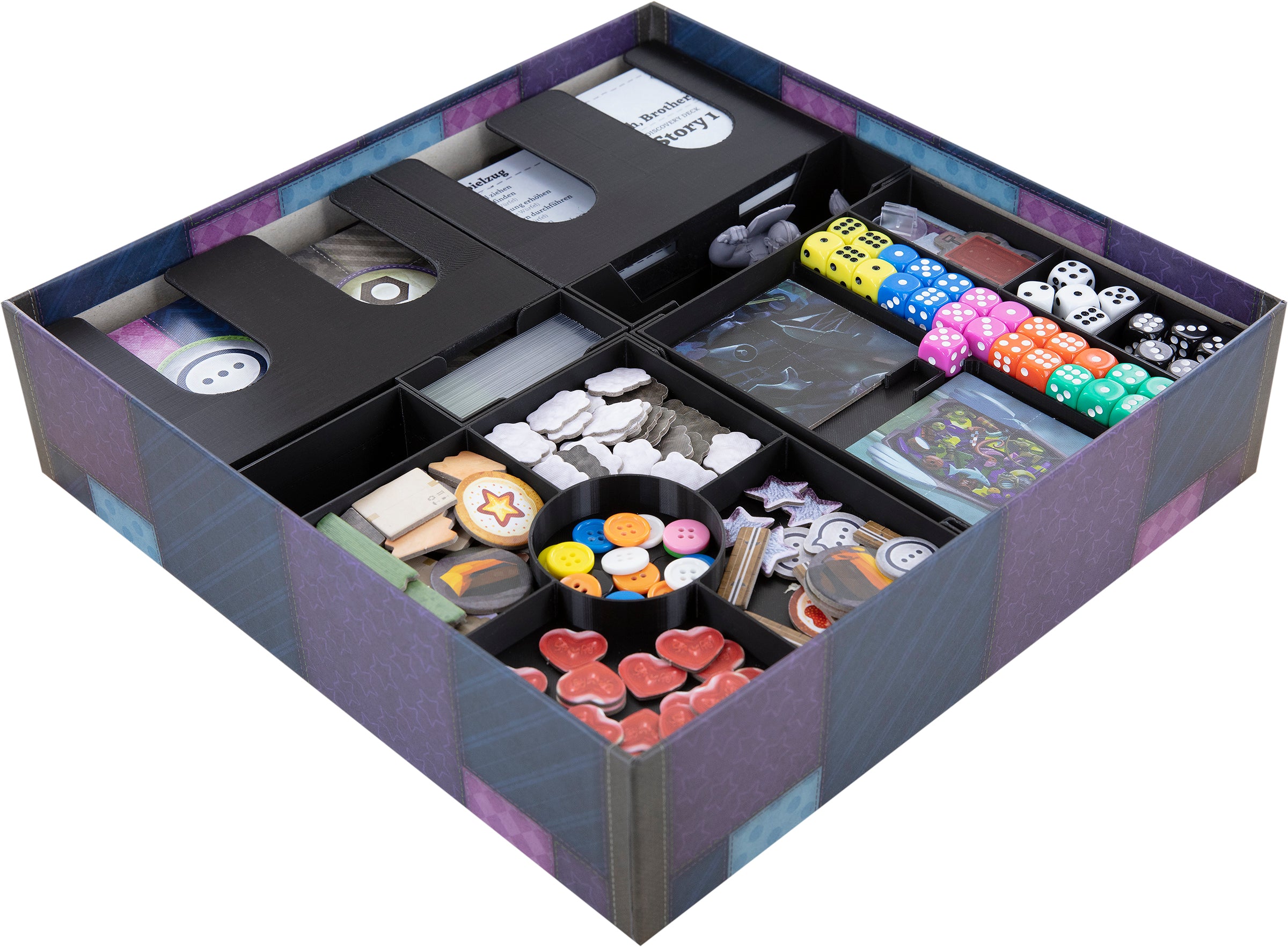 - 1 token holder with six compartments for small game components like the dice, threat white dice, black dice, story-specific tokens, bookmark token, large Story specific Token, and the broken toy pile.