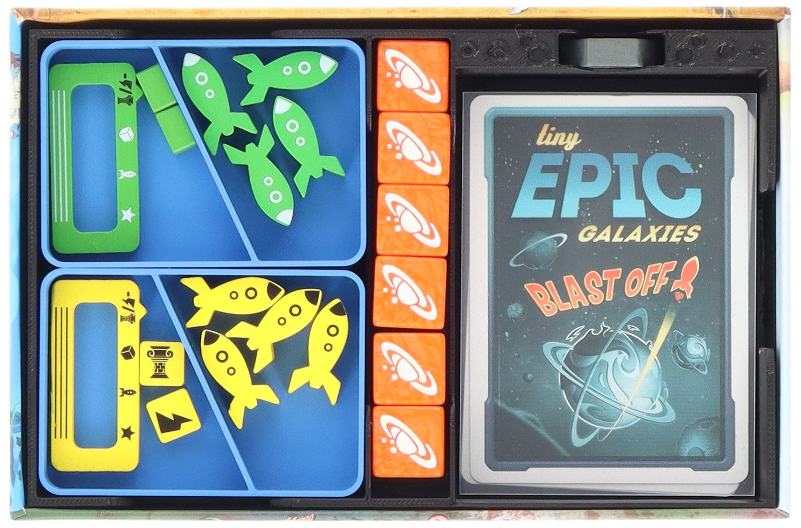- The plastic Organizer neatly fits into the original Tiny Epic BLAST OFF! core game box (Organizer dimensions: approx. 166 x 106 x 32 mm).