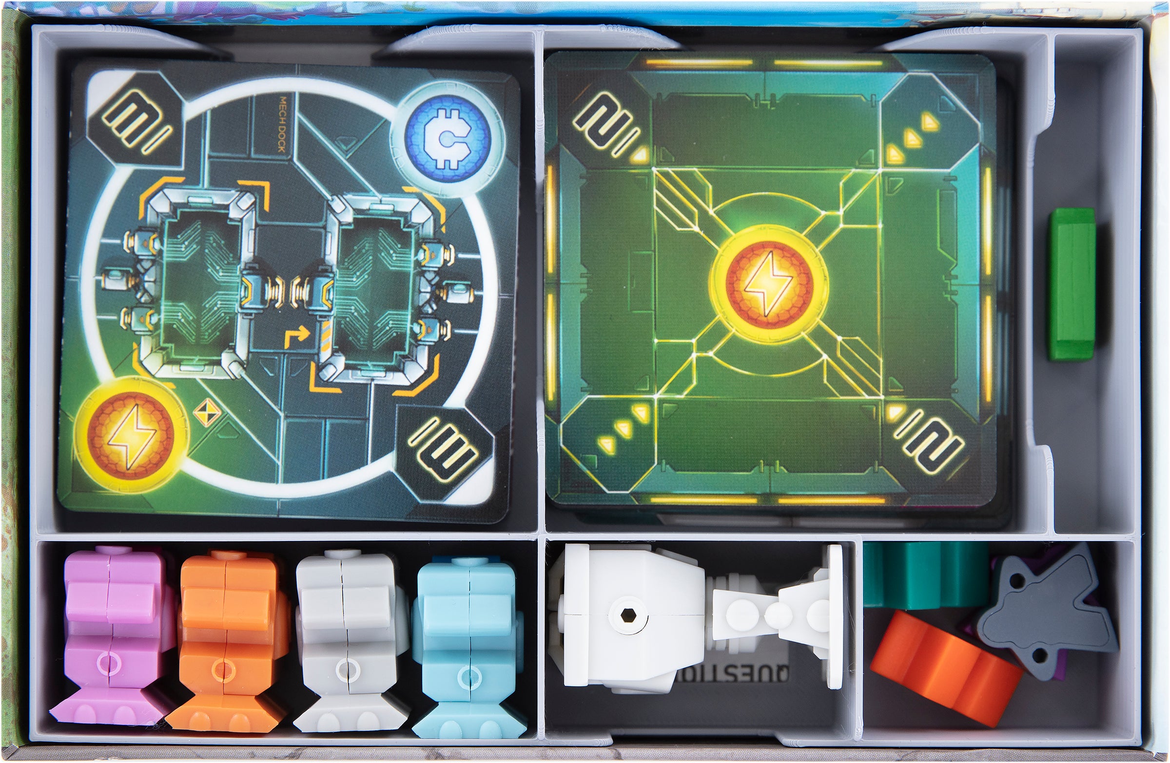 - 1 token holder with six compartments for Power Armors, ITEMeeple, Kickstarter exclusive Pilot ITEMeeples, First Player Token, Round Token, and square-format game cards (Zone, Weapon, Program, and Ad hoc Mode Cards). Of course, the game cards also fit with protective sleeves.