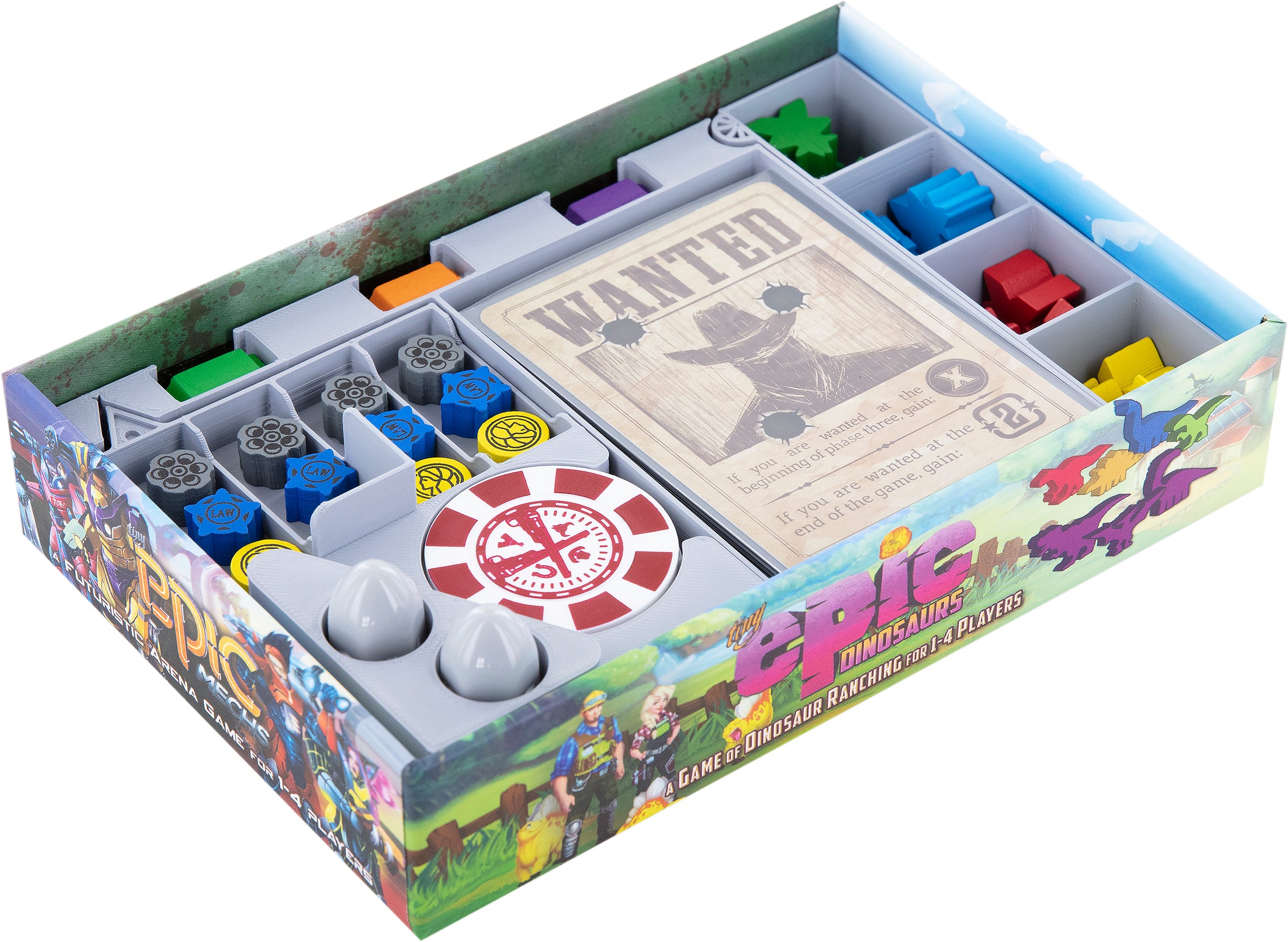 • The Organizer provides space for all of Tiny Epic Western's cards, tokens, and dice.