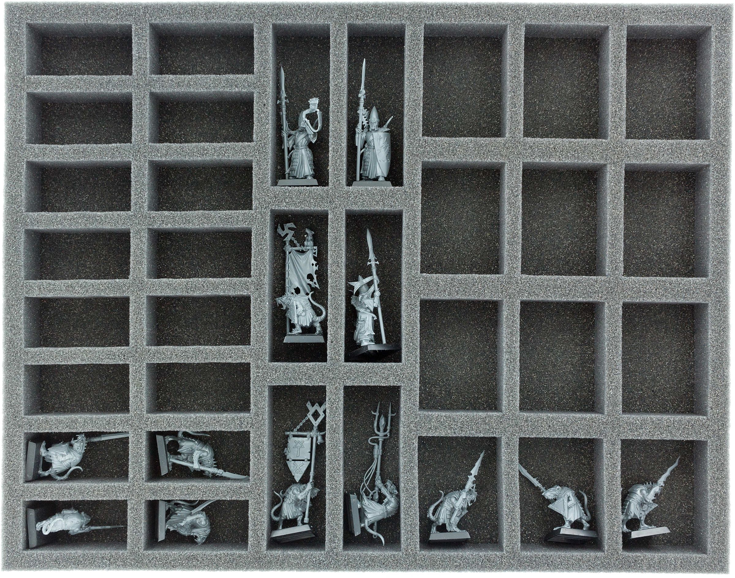 On this Full-Size foam tray you have space for up to 34 miniatures of your army. The insert is ideal for storing standard infantry and bulky miniatures such as heroes, standard-bearers, musicians.