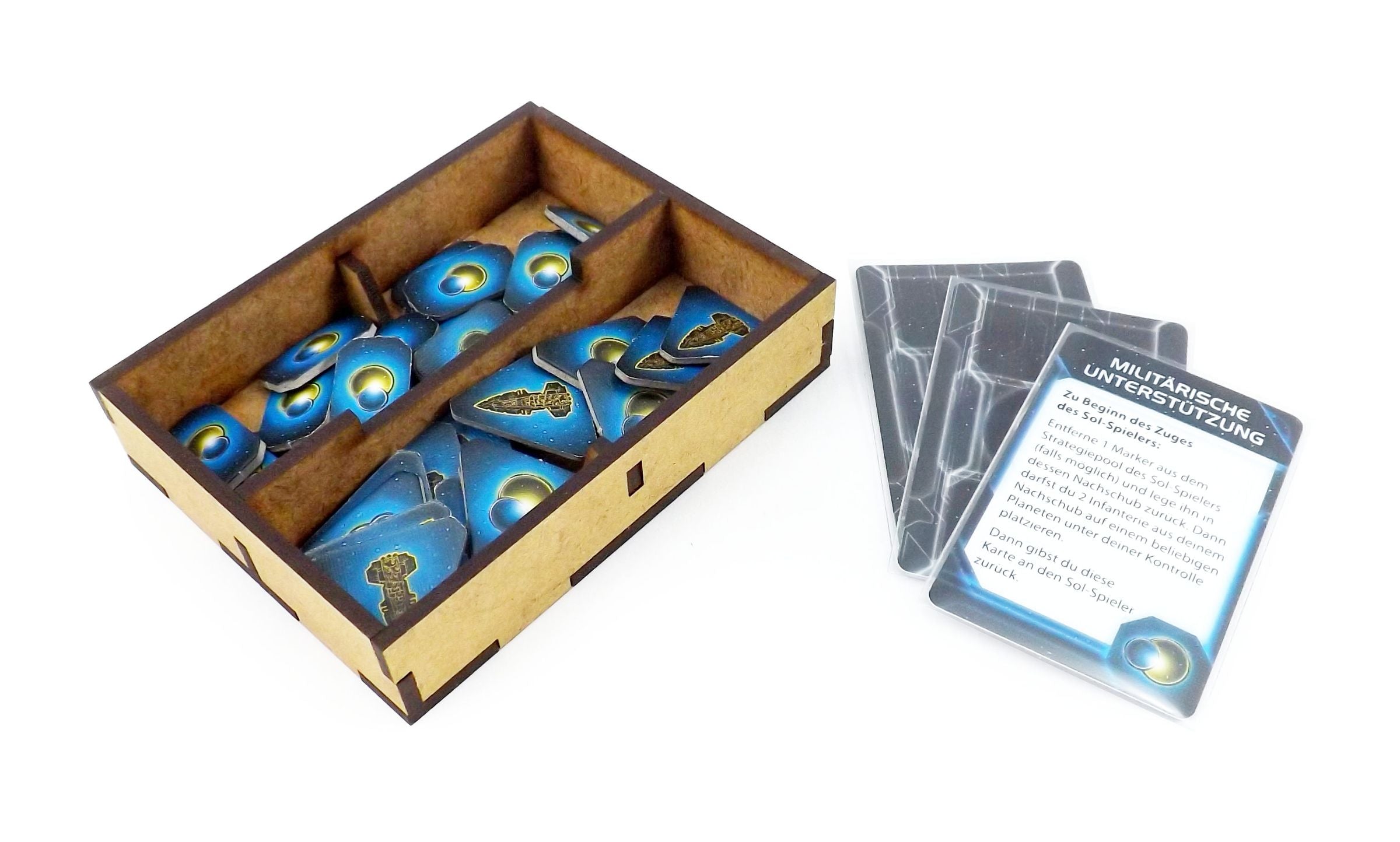 An undertaking of cosmic proportions - a race to the stars, your people colonizing new planets and your race advancing through trade, politics and military to create an everlasting star empire. In Twilight Imperium 4 the stakes are high; there are not only enough game components to set up part of the galaxy, you can also choose from 17 different factions. Hundreds of spacehip miniatures and hundreds of cards want to be neatly stored. Our organizer comes to the rescue with custom storage for all components, creating order in the vastness of space.
