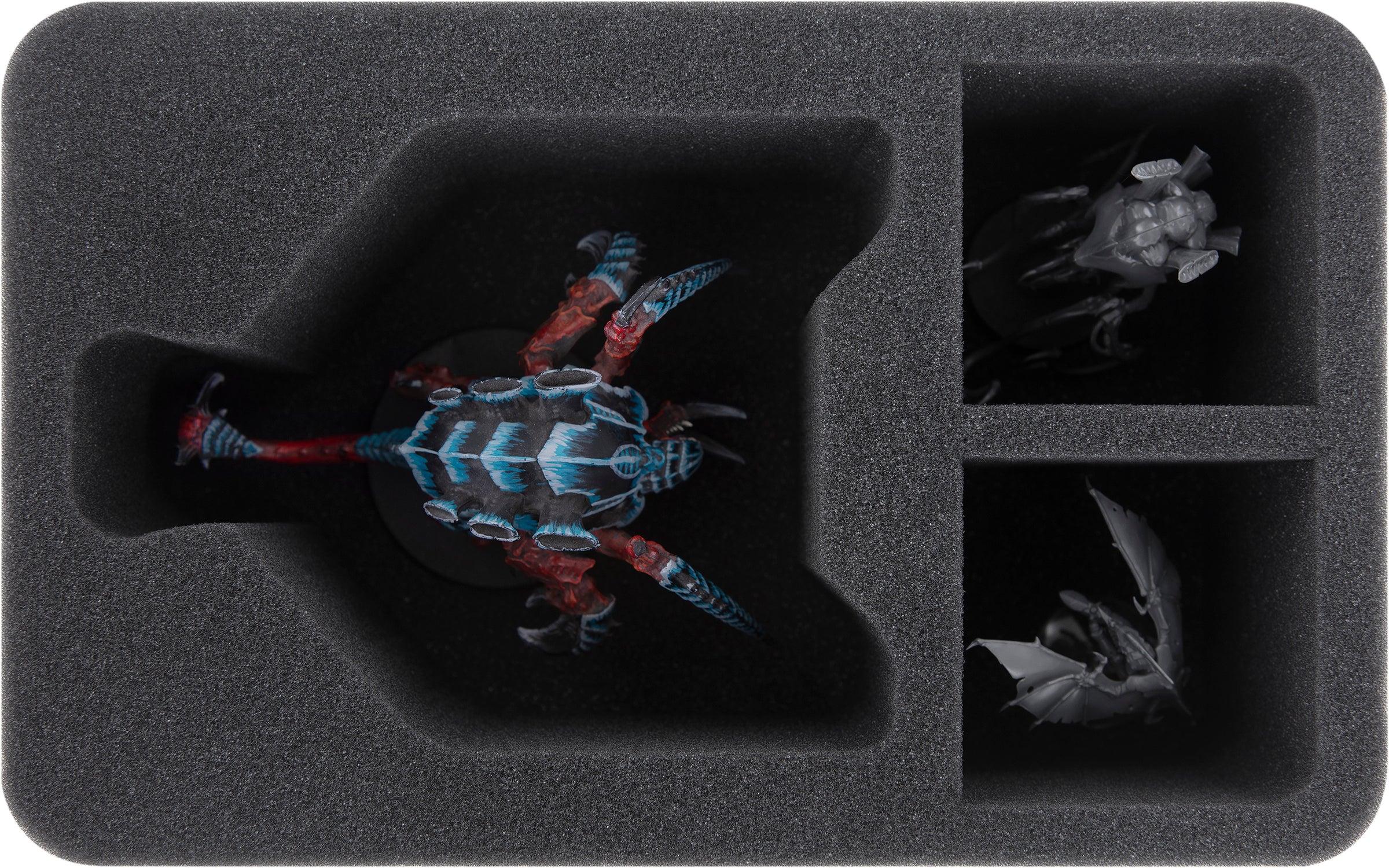 Two identical Half-Size foam trays, each with three compartments, provide you with space for the Hive Fleet's battering rams, the Carnifex. You'll find one compartment individually shaped for the Carnifex to accommodate the heavily armored creature.