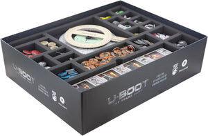Un'accurata custodia per UBOOT assicura che carte, segnalini, figure e componenti del tabellone di gioco rimangano al sicuro e che il gioco possa essere allestito molto più rapidamente. Grazie agli inserti e alle soluzioni di trasporto coordinati, l'equipaggio del sottomarino rimane organizzato e pronto all'azione, sia a casa che in viaggio.