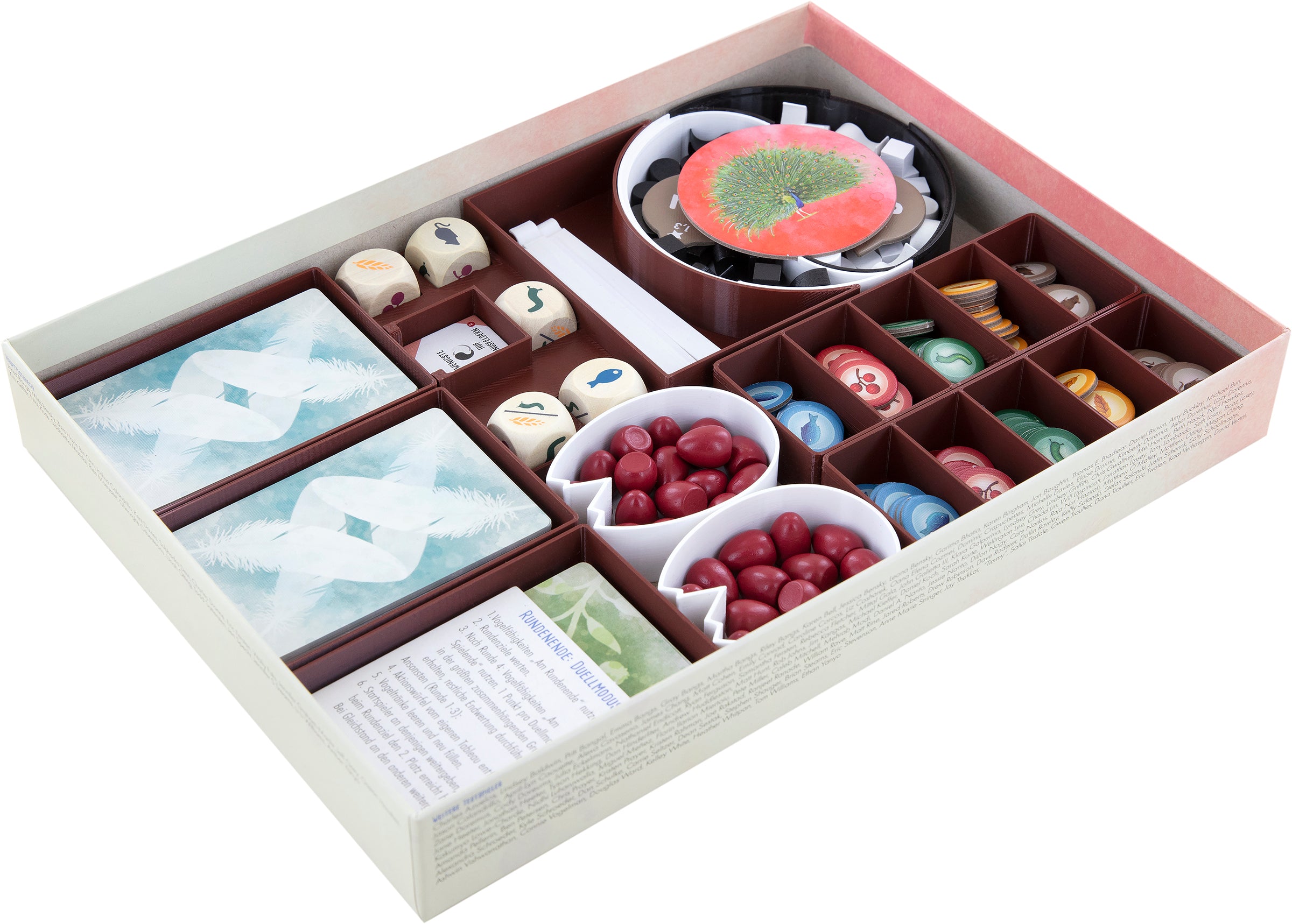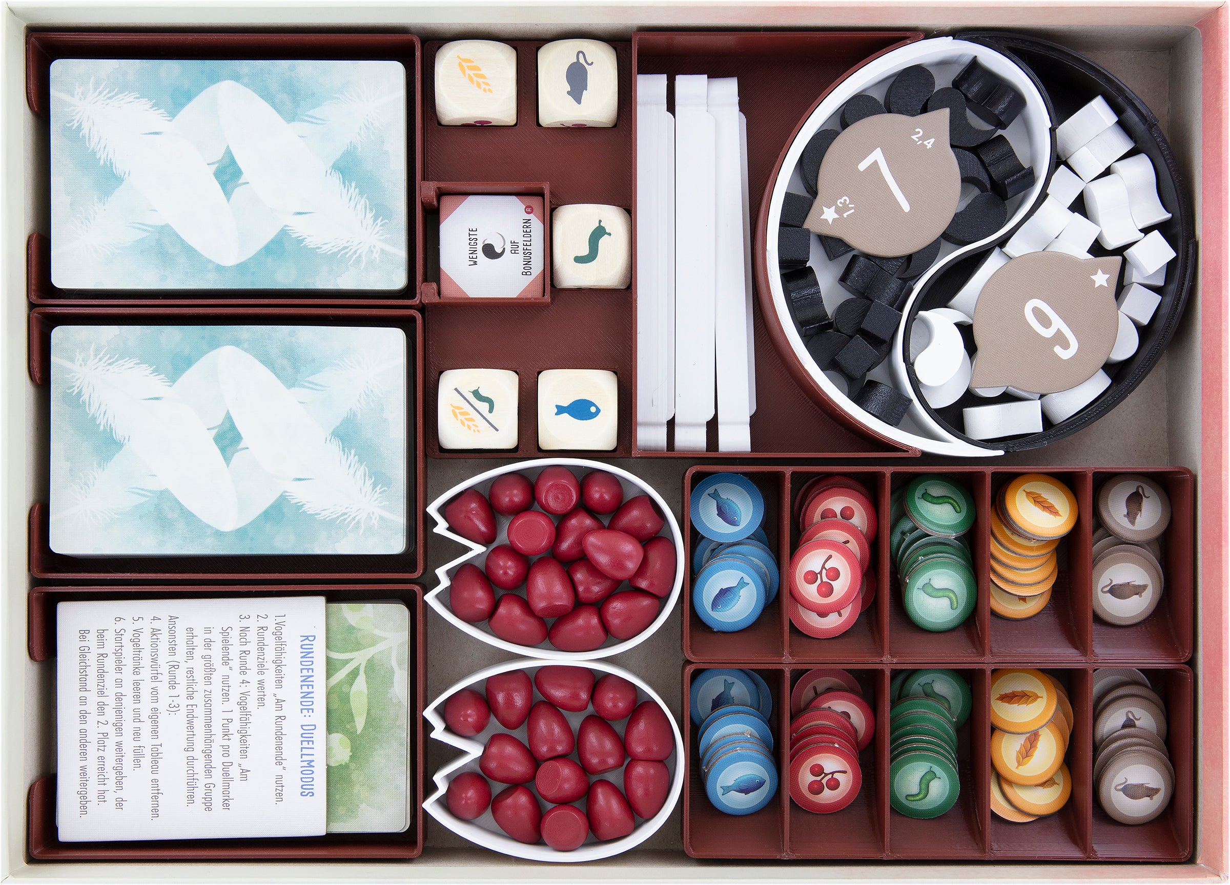 So that you can peacefully devote yourself to the birds of Asia, we have taken over the order in your board game box. Three card holders and seven token trays provide the necessary order in your box. Each card and token has its own compartment. Due to the clear structure, you know where your game material is. But not only in the game box but the inserts also provide order on the tabletop. It doesn’t matter if you play the expansion in two-player mode or with the main game and other expansions. The trays help you keep track of everything.