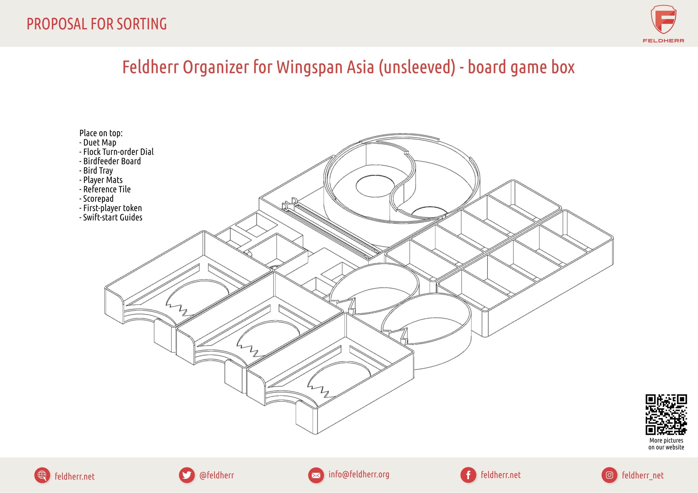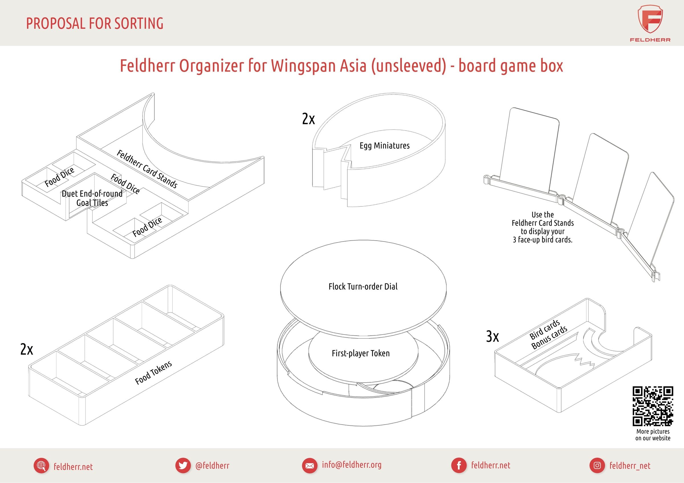 - The Organizer is designed for cards without protective sleeves. More space for sleeved cards is available in the Feldherr Organizer for Wingspan Asia ORG201.