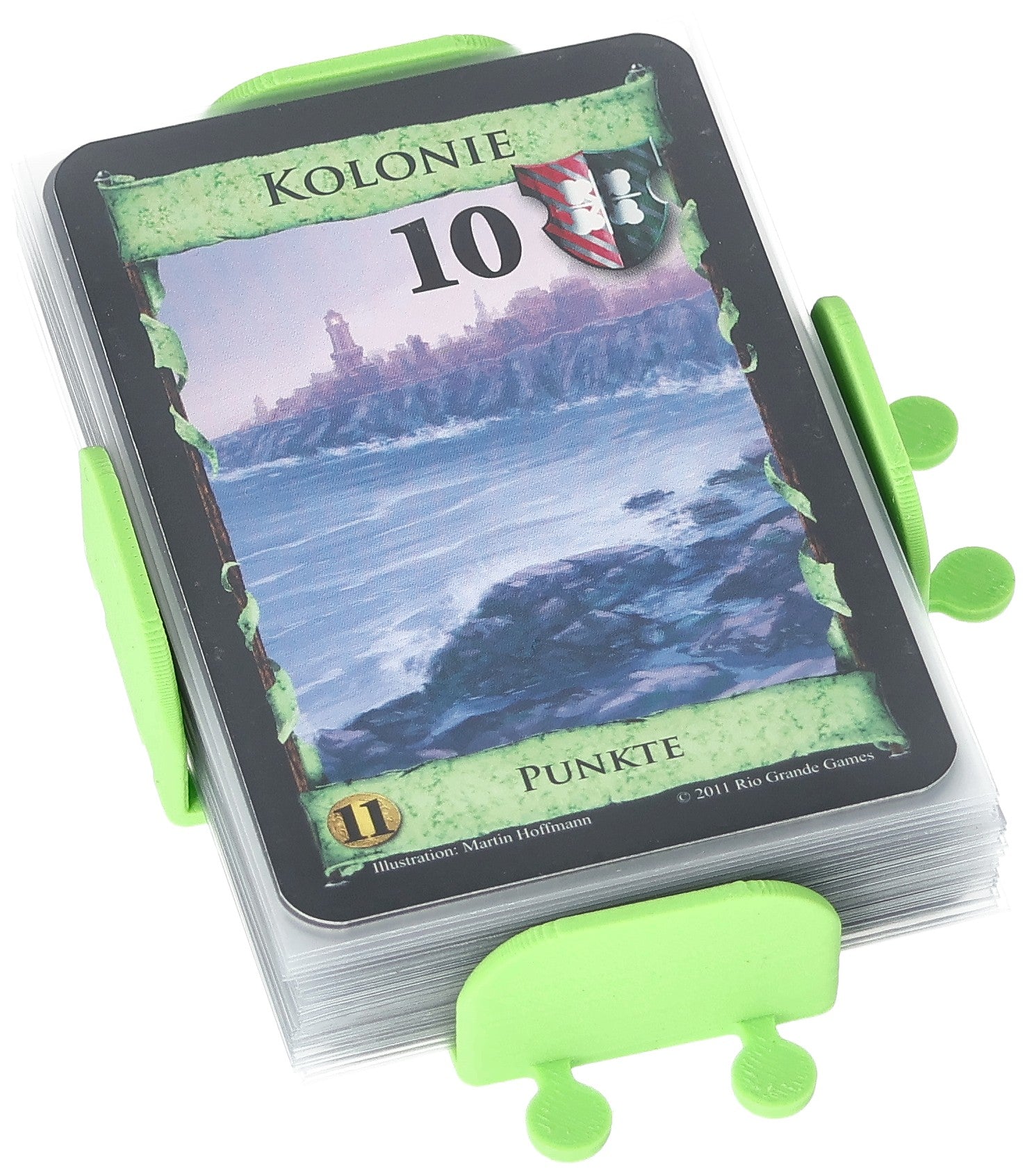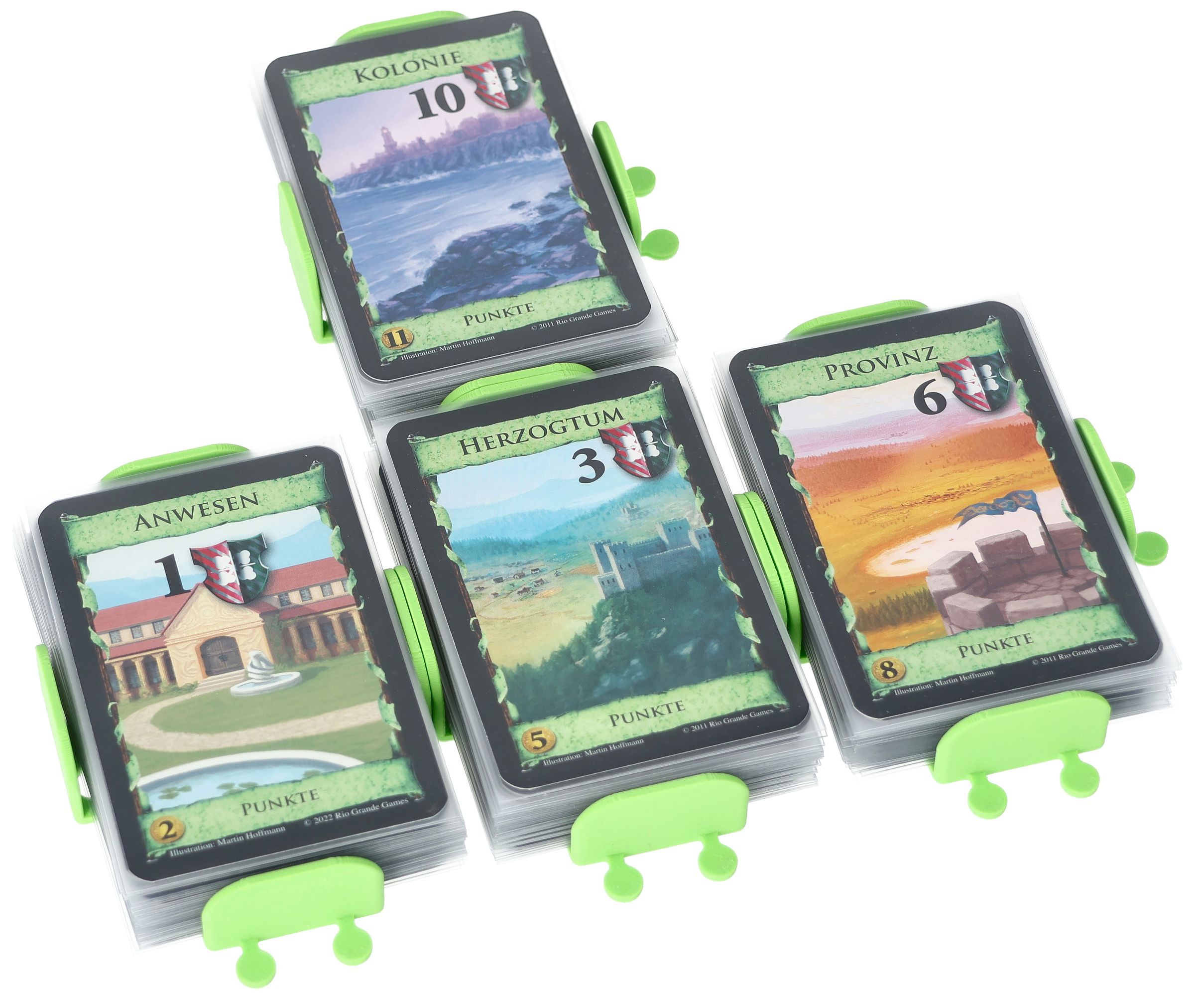 - The green color of the card holder resembles the green of the basic Victory cards and will lead to an improved overview.