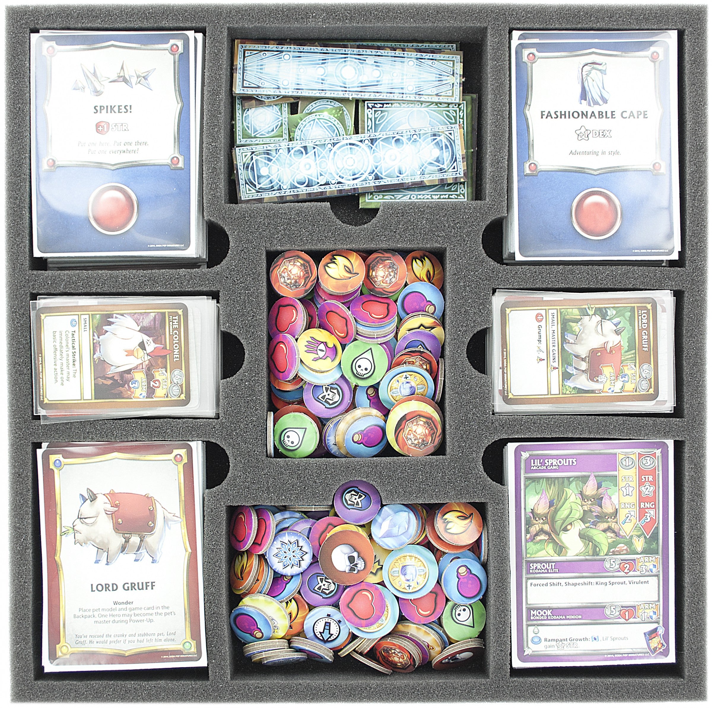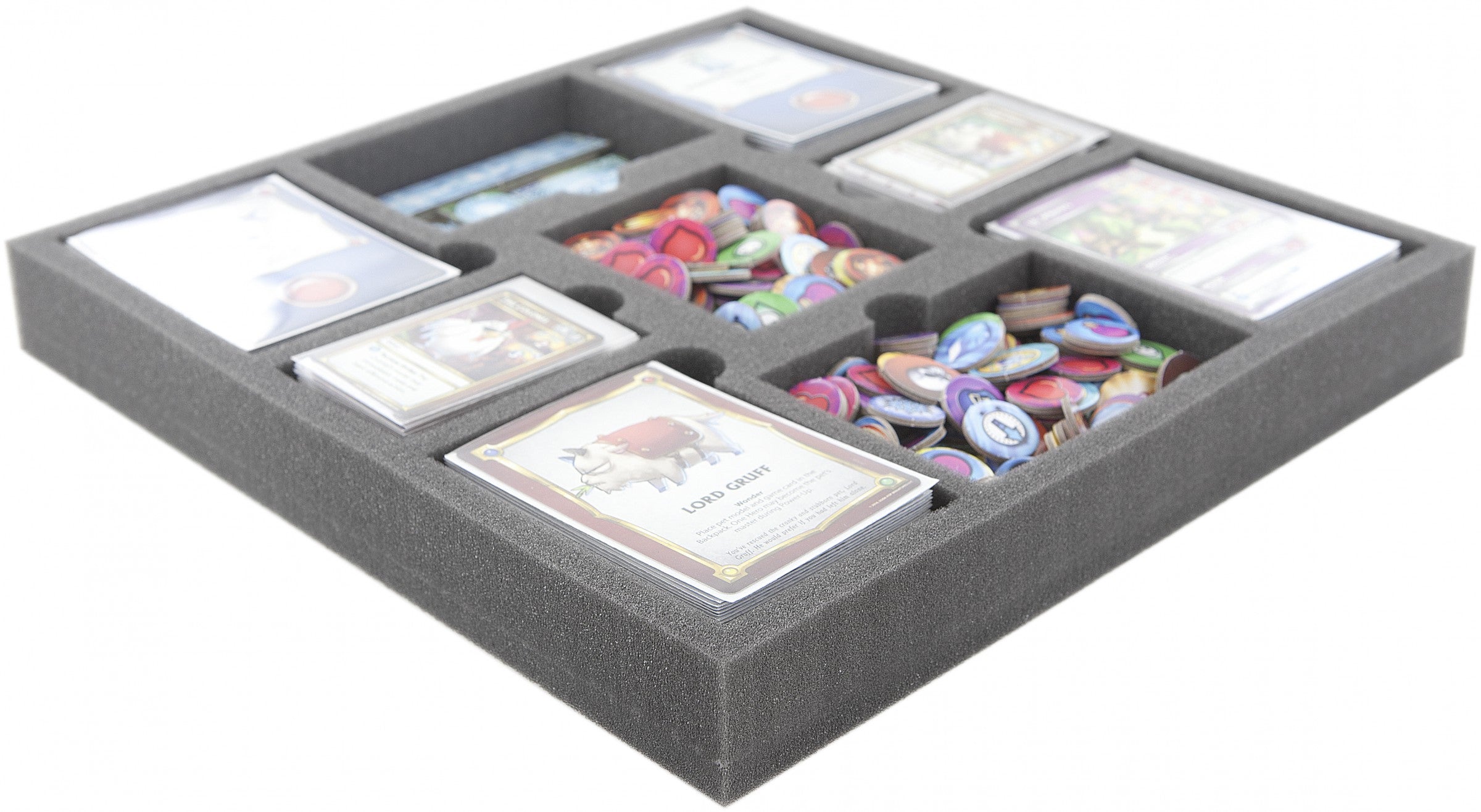 Vassoio in schiuma speciale per Super Dungeon Explore - Forgotten King. I 9 scomparti di diverse dimensioni sono gettoni e carte in maniche.