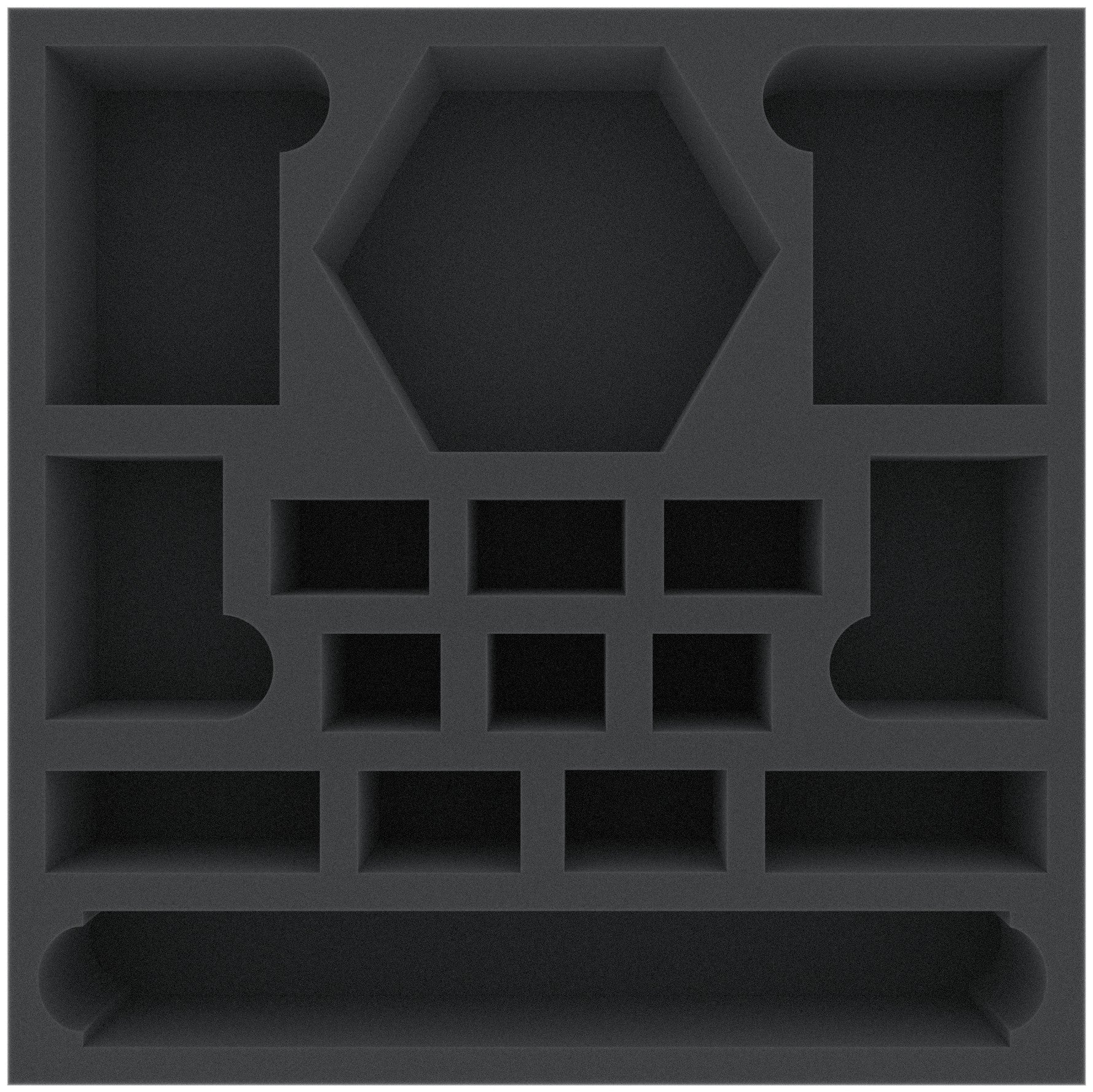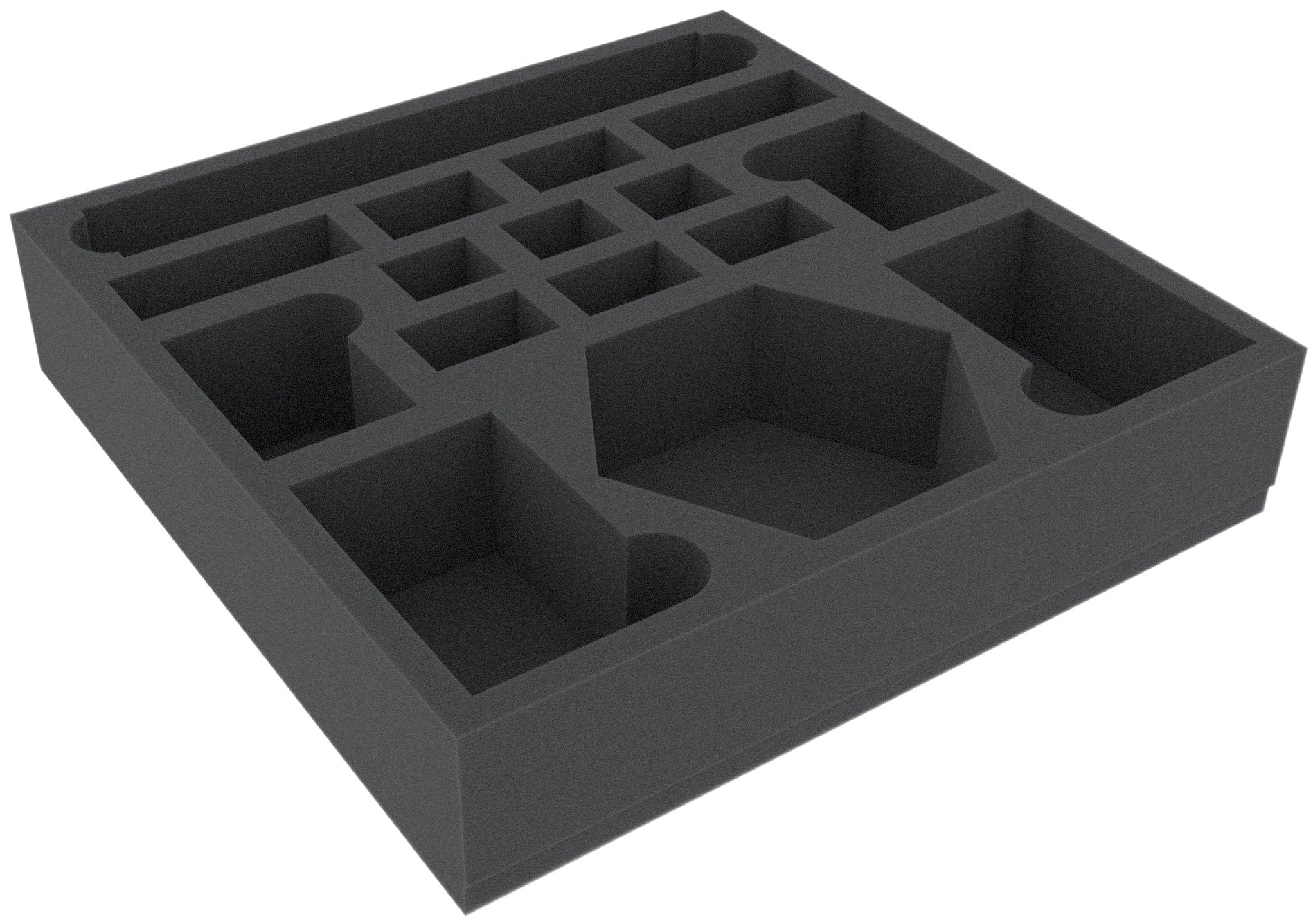 This foam tray is specially designed for Fallout: the board game. So you can transport and protect all game components in 16 compartments. The mat contains tailor-made slots for Plastic Figures, Map Tiles, Tokens, Pegs, Dice, Survivor Boards and Cards. The topper has a cut-out exactly for the Survivor Boards. So the lid of the box closes perfectly. The Scenario Sheets and Game Instructions can be stowed on top of the foam.