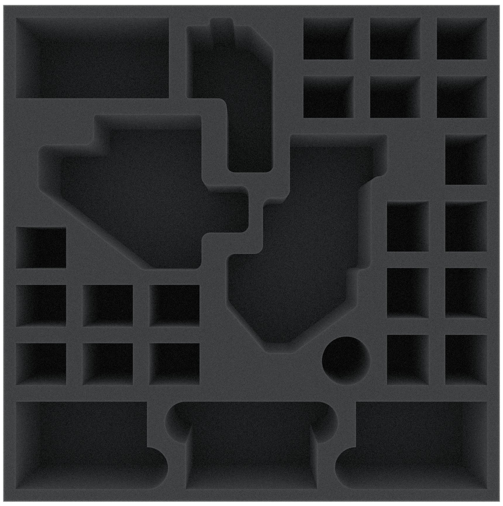 This foam tray suitable for retrofitting in many original board games boxes. The 28 different sized compartments are suitable for all conceivable game material. So miniatures, cards, markers and dice can be kept in well.