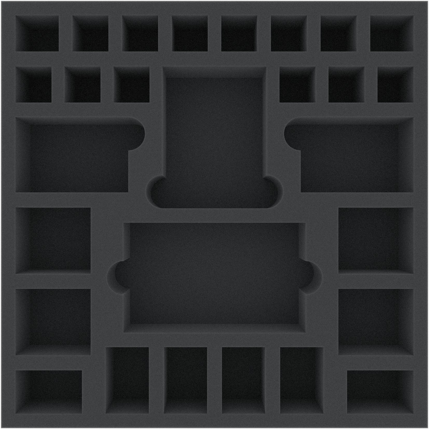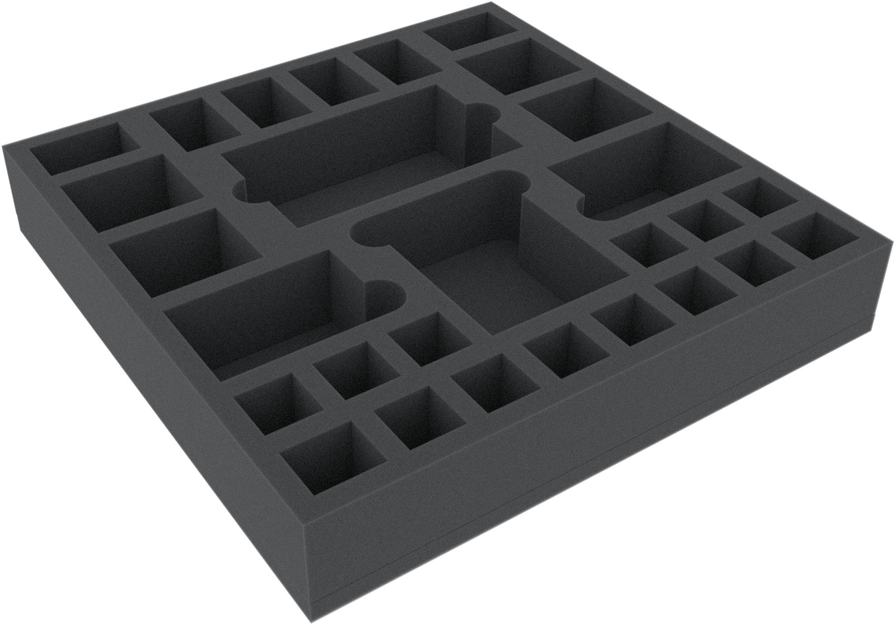 Foam tray with 28 compartments especially for Arcadia Quest: Pets. The 28 different compartments are perfect for the miniatures and cards in sleeves. The foam tray fits perfectly into the original board game box, or into the Feldherr box LBBG.