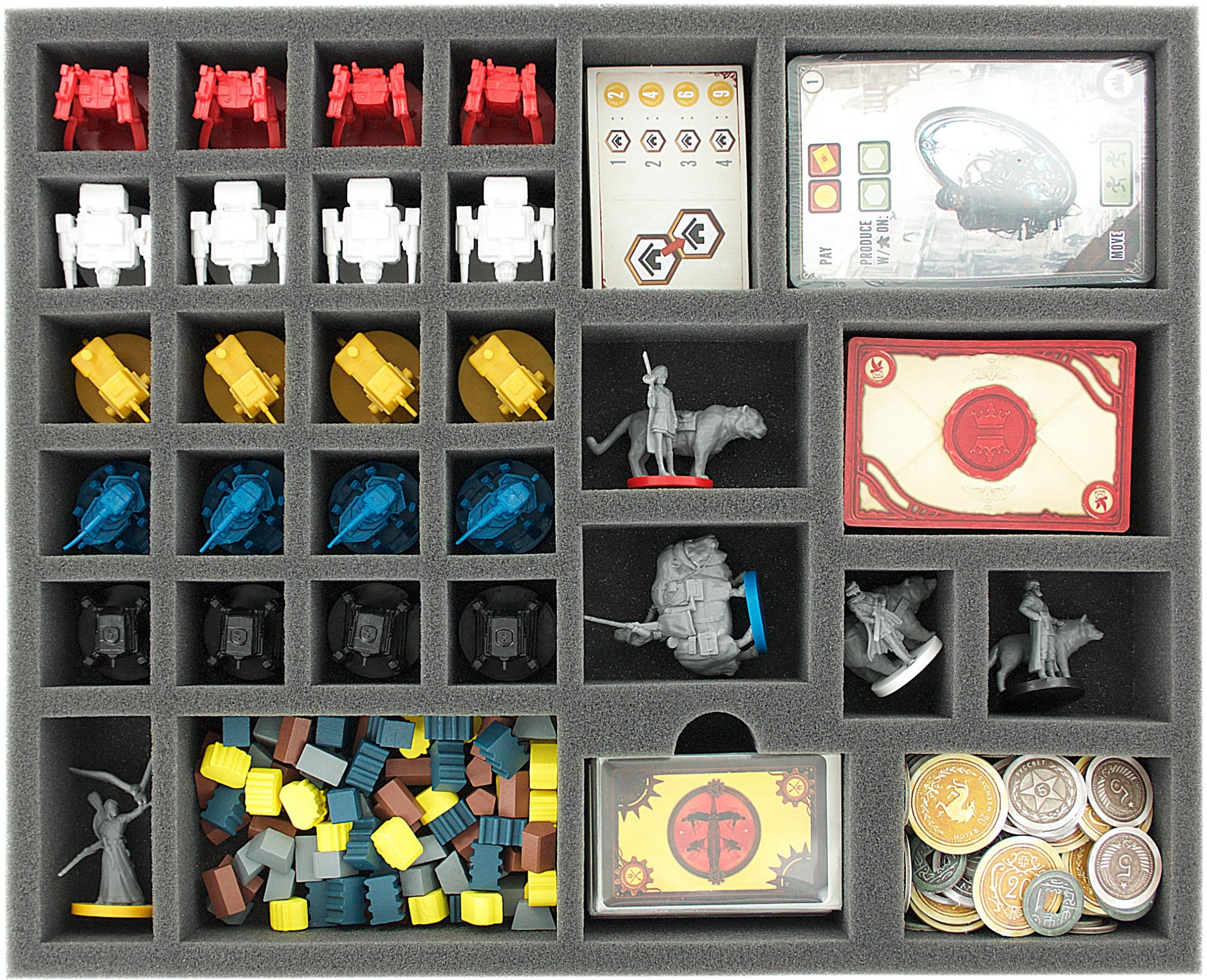 Foam tray especially for the original Scythe board game box. In the tray comfortable 20 mechs, 5 characters, cards and tokens can be stored.