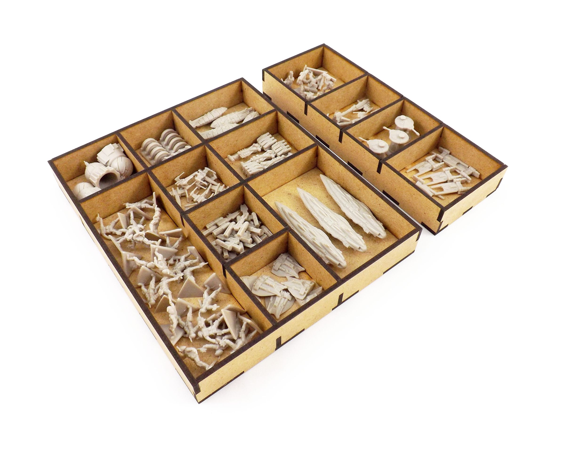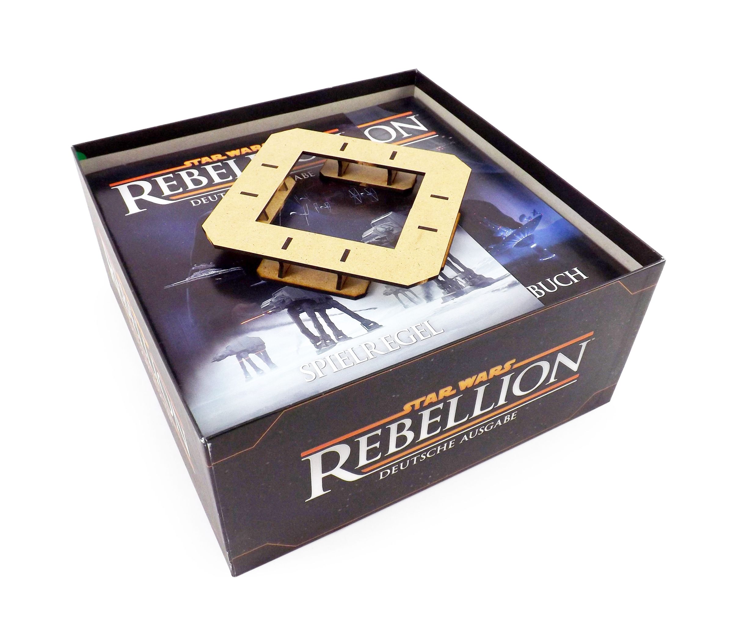 A small group of rebels challenges the military might of the Galactic Empire. The future of the galaxy is at stake! This epic conflict brings literally hundreds of spacecraft miniatures as well as several stacks of cards, leaders, markers and dice onto the table. Our insert offers custom storage for all components of base game and expansion, giving the factions full control over their assets.