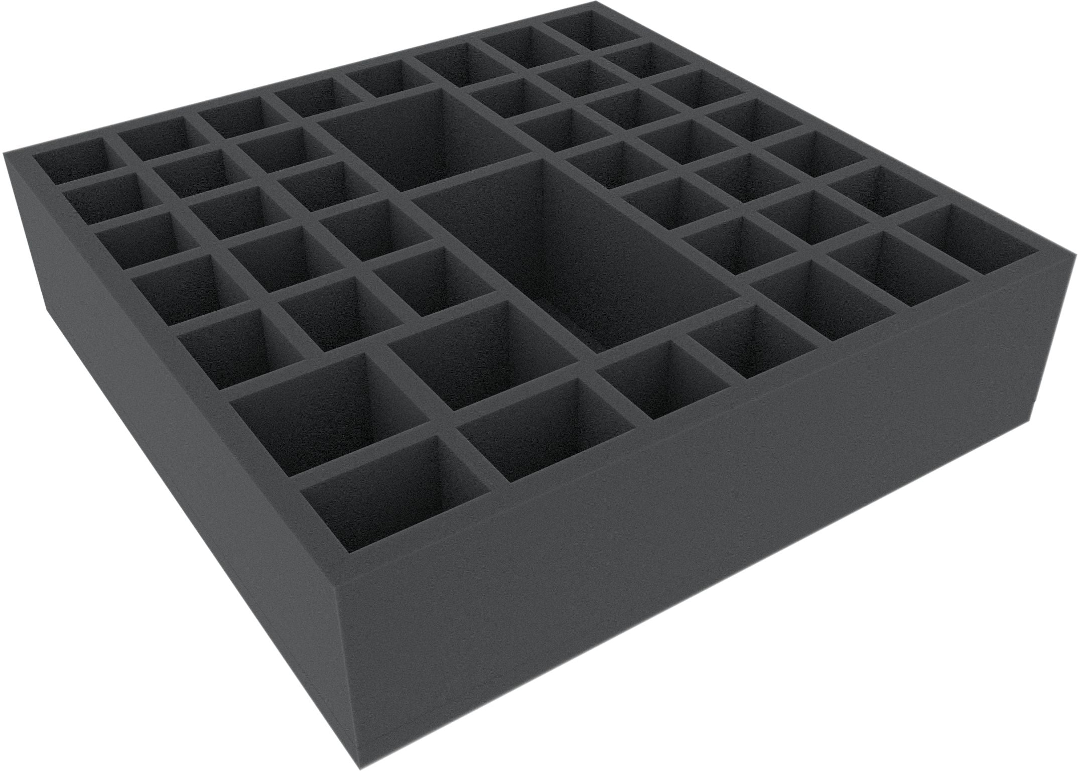 This 75 mm high foam tray is divided into 45 compartments. It is particularly suitable for the safe storage of tabletop and board game miniatures, as well as other fragile models and small parts.