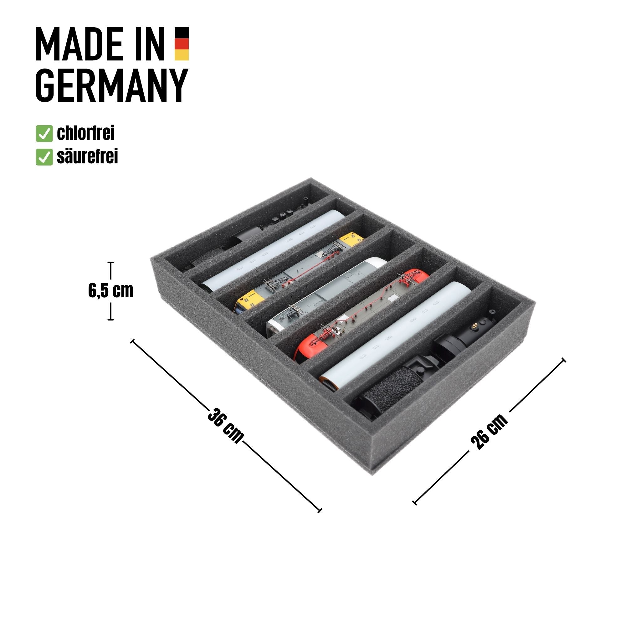 Whether for transport to exhibitions, module meetings, or safe storage on shelves at home, this insert keeps your H0 scale locomotives and cars reliably protected. The 7 compartments hold the models upright and shield them from bumps and scratches.