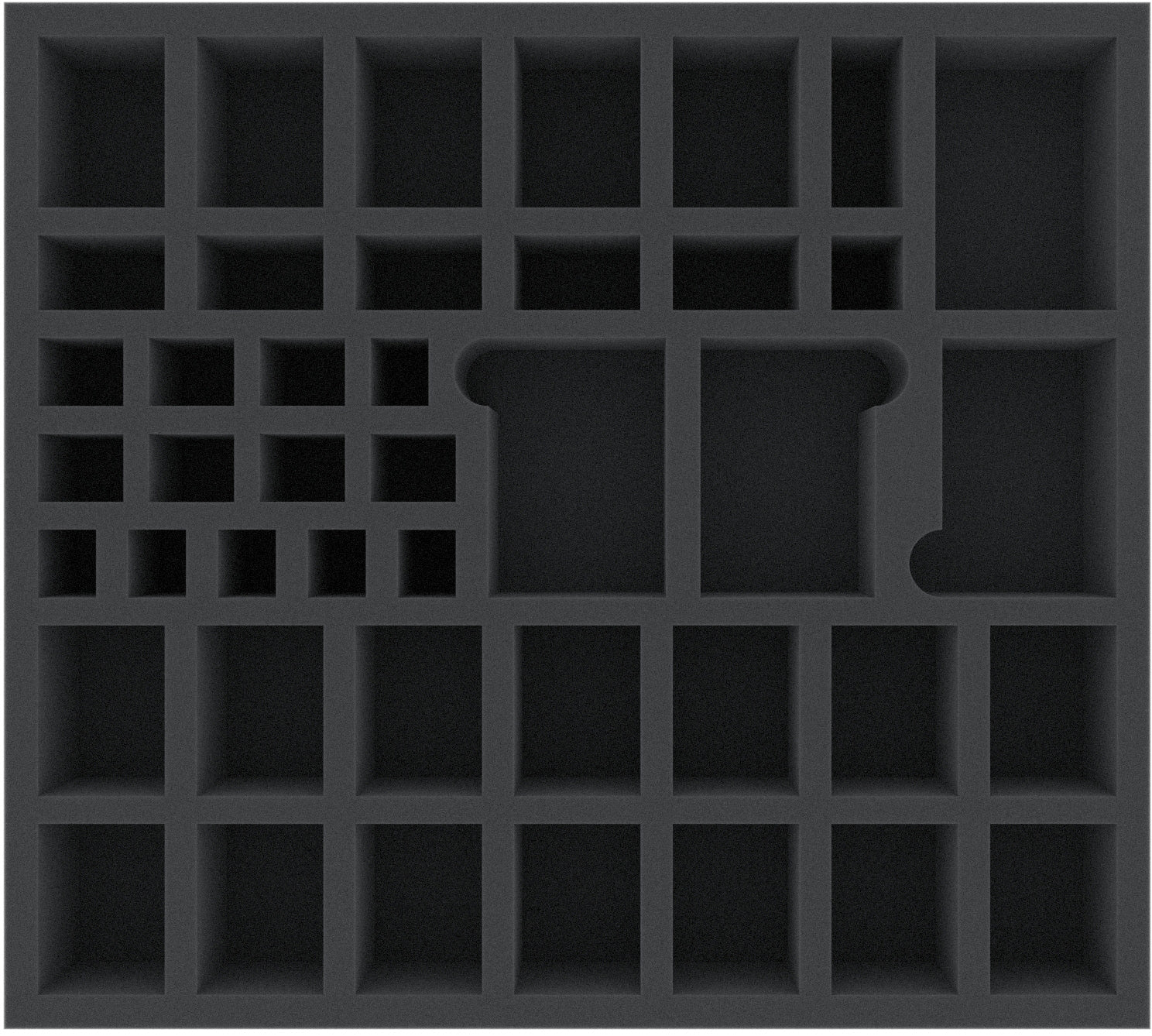 This foam tray is divided into 43 compartments of different sizes. It is particularly suitable for safe storage of miniatures and game material in board game boxes.