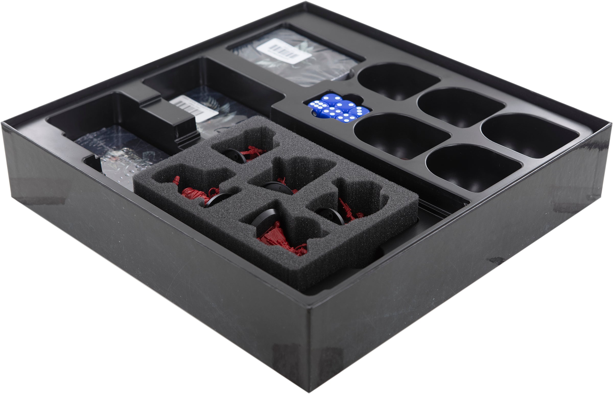 - The foam tray fits exactly into the large rectangular recess, next to the cards, of the plastic tray of the original board game box.