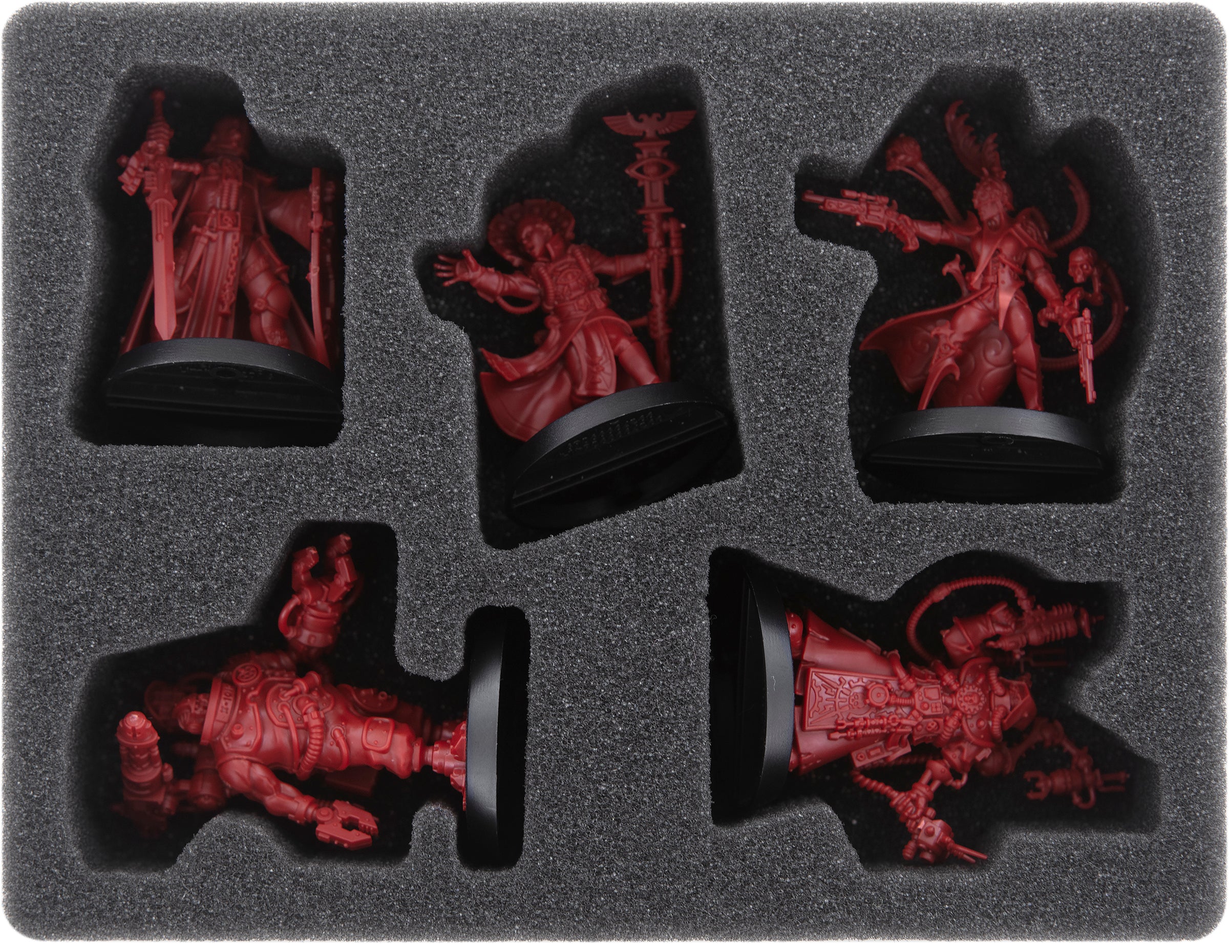 The inlay is divided into 5 miniature-precise cut compartments for the Combat Servitor X-101, Rogue Trader Neyam Shai Murad, Technoarchaeologist Daedalosus, Crusader Gotfret de Montbard, and Primaris Psyker Aradia Madellan.