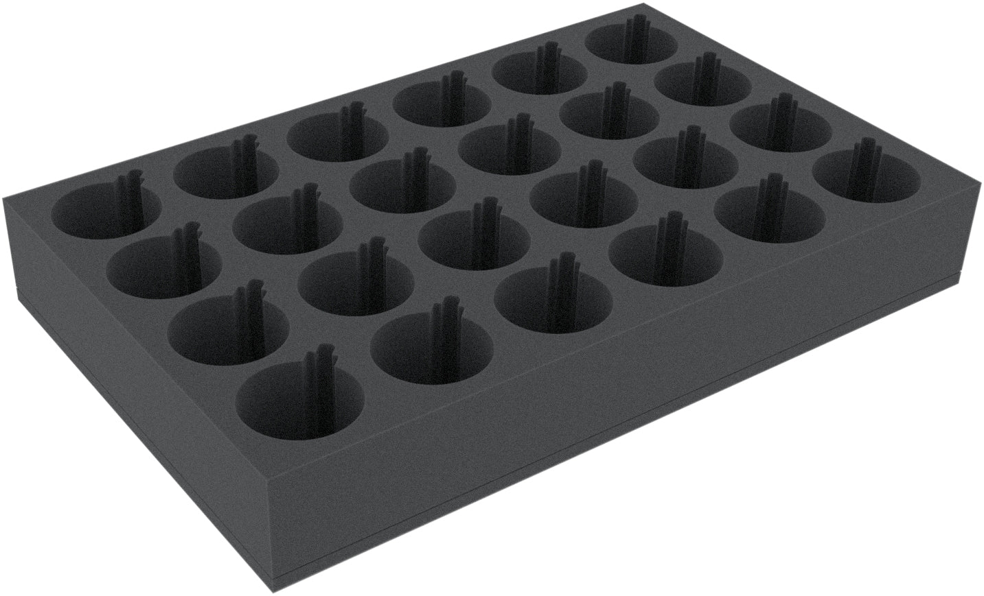 A 80 mm high foam insert with 24 circular compartments of 70 mm diameter with small bell- or lamp-shaped extension.