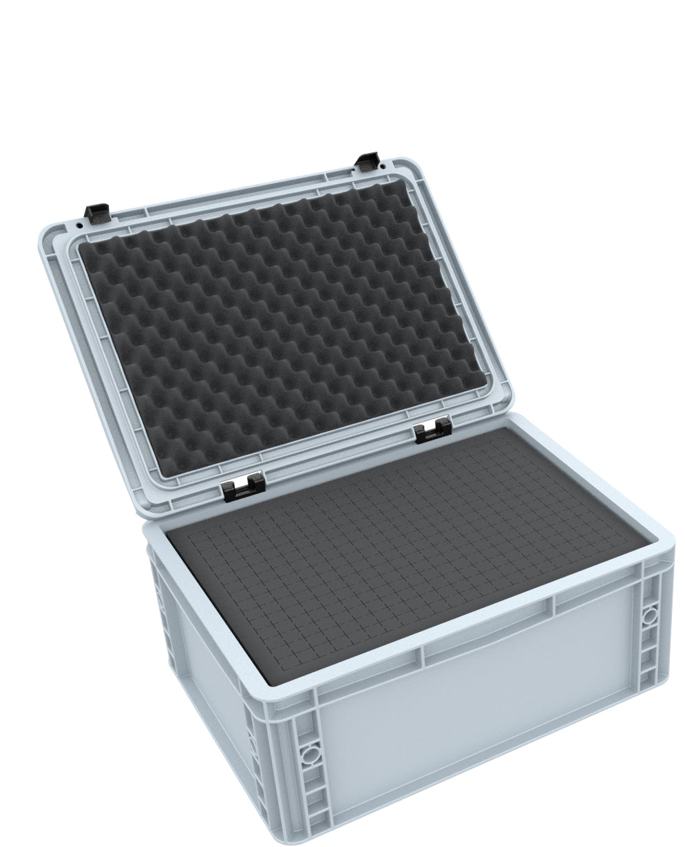 Set of Eurobox 400 mm x 300 mm x 185 mm filled with 2 Pick and Pluck foam insert.