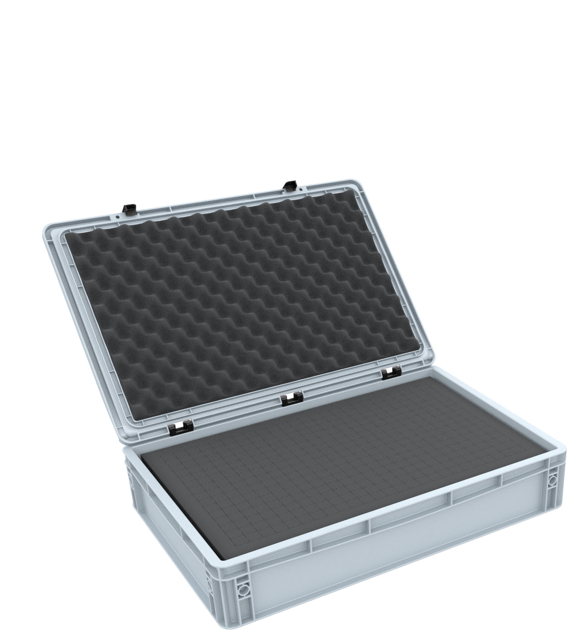 Set of Eurobox 600 mm x 400 mm x 135 mm filled with 1 Pick and Pluck foam insert. The grid of the foam allows an individual adaptation of the foam inserts to all shapes. It is ideally suited as protection for the transport of various industrial products such as medical equipment, tool components or technical equipment. The pick and pluck foam is perforated with a grid of 20 mm x 20 mm x height of the insert (90 mm) and a circumferential edge of 25 mm. As a bottom we use a 10 mm thick base (DS010B), which makes it possible to transport even heavy products. The nap foam serves as top cover and is cut exactly to fit the lid of Auer's Eurobox. Since it is equipped with a self-adhesive foil, you do not need any further tools. All you have to do is remove the adhesive foil from the foam insert and glue the self-adhesive side into the hinged top of the Eurobox. The entire set can therefore be designed, adapted and used according to your personal needs without special tools.