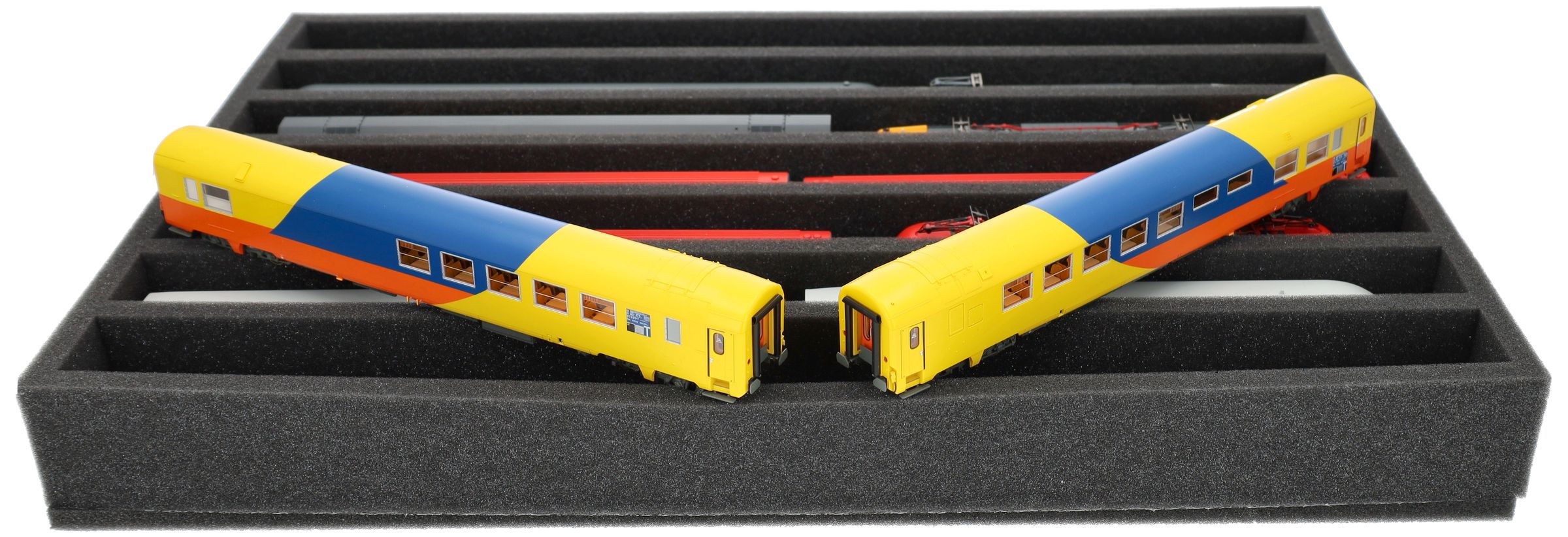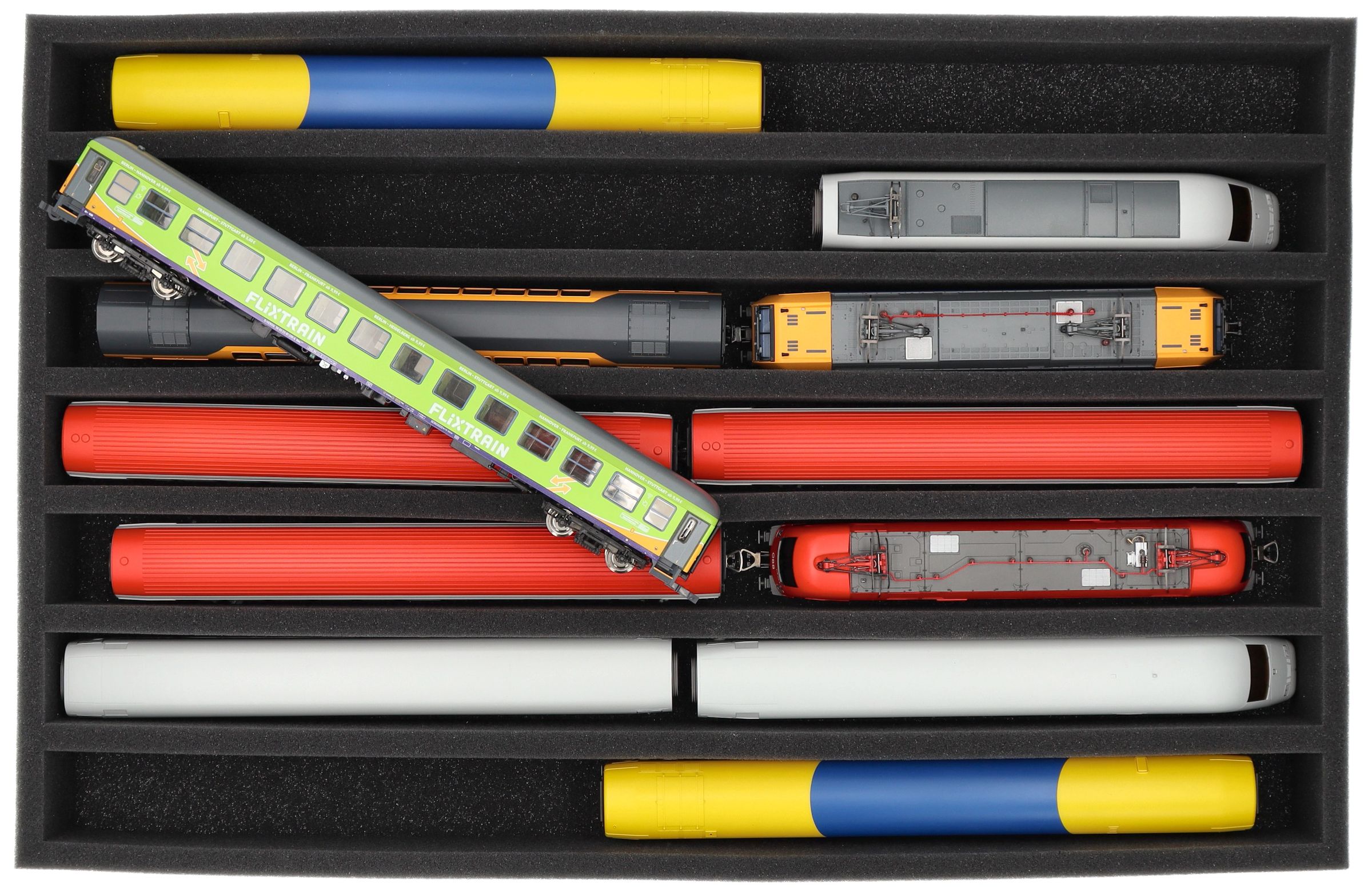 Whether for transport to exhibitions, module meetings, or safe storage on shelves at home, this insert keeps your H0 scale locomotives and cars reliably protected. The 7 compartments hold the models upright and shield them from bumps and scratches.