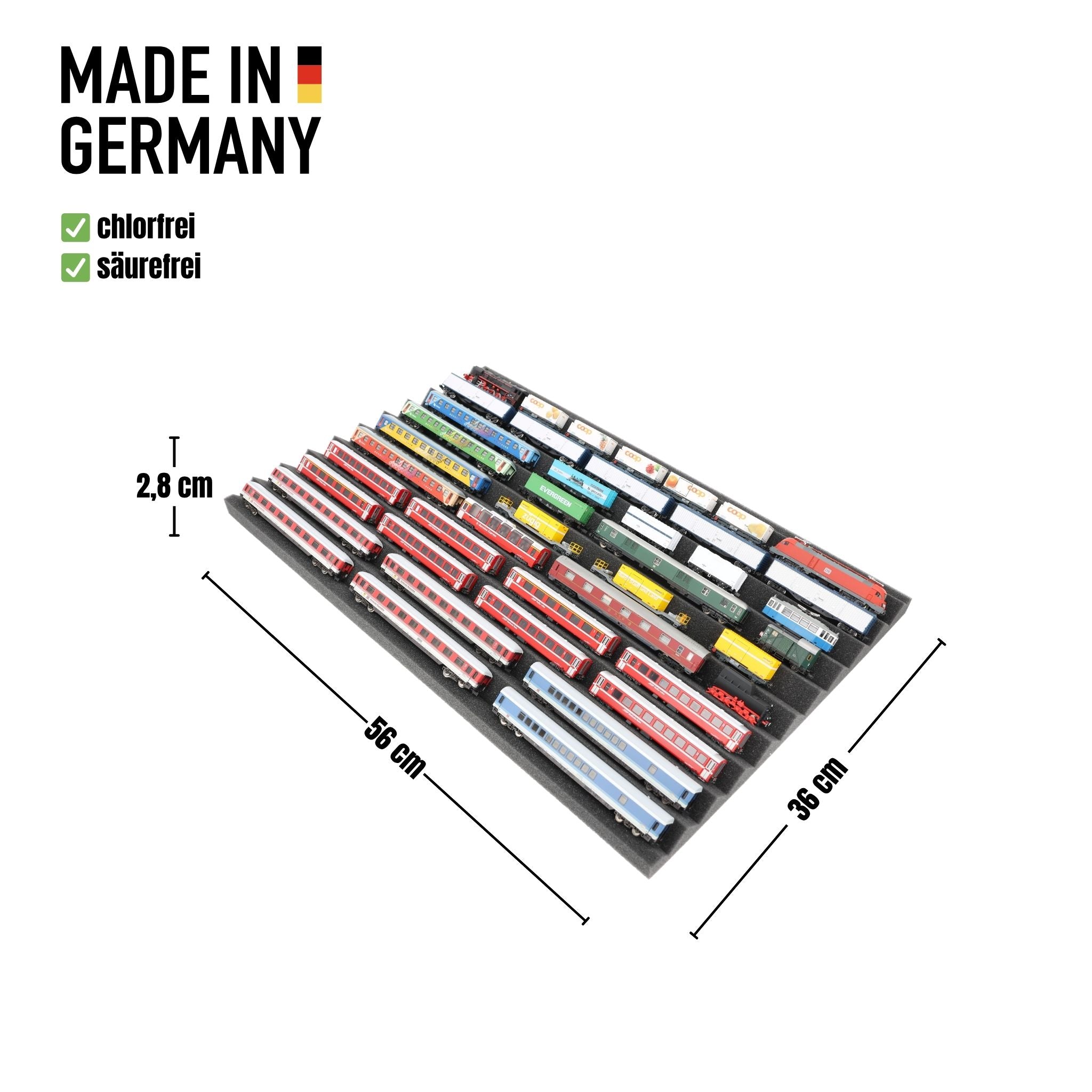 Ten compartments, tailor-made for model railways in gauge N, offer your locomotives and wagons reliable protection for storage and transport.