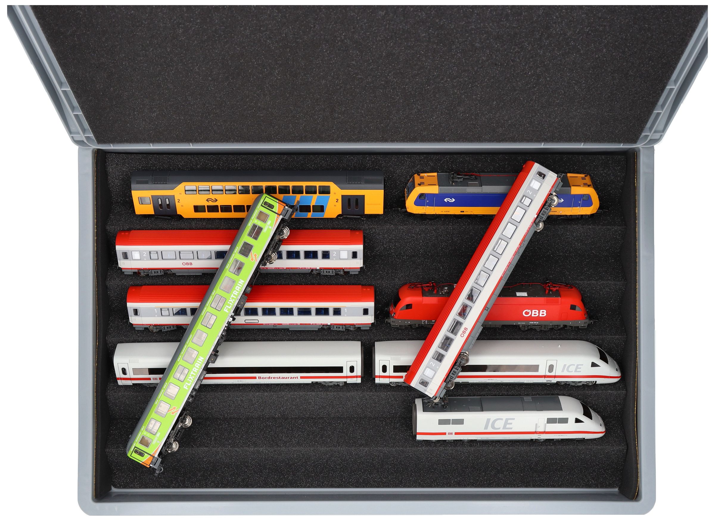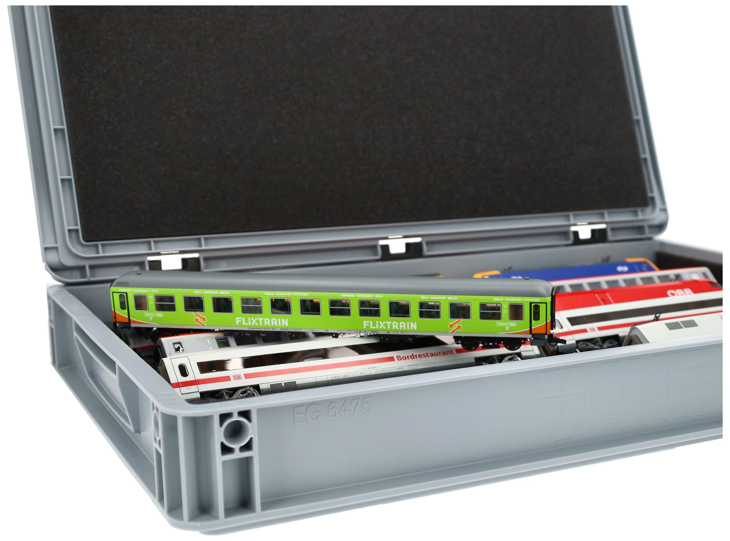 Neatly stored, attractively displayed and safely transported – The flexible foam insert for model railways in H0 scale in the sturdy Eurobox.