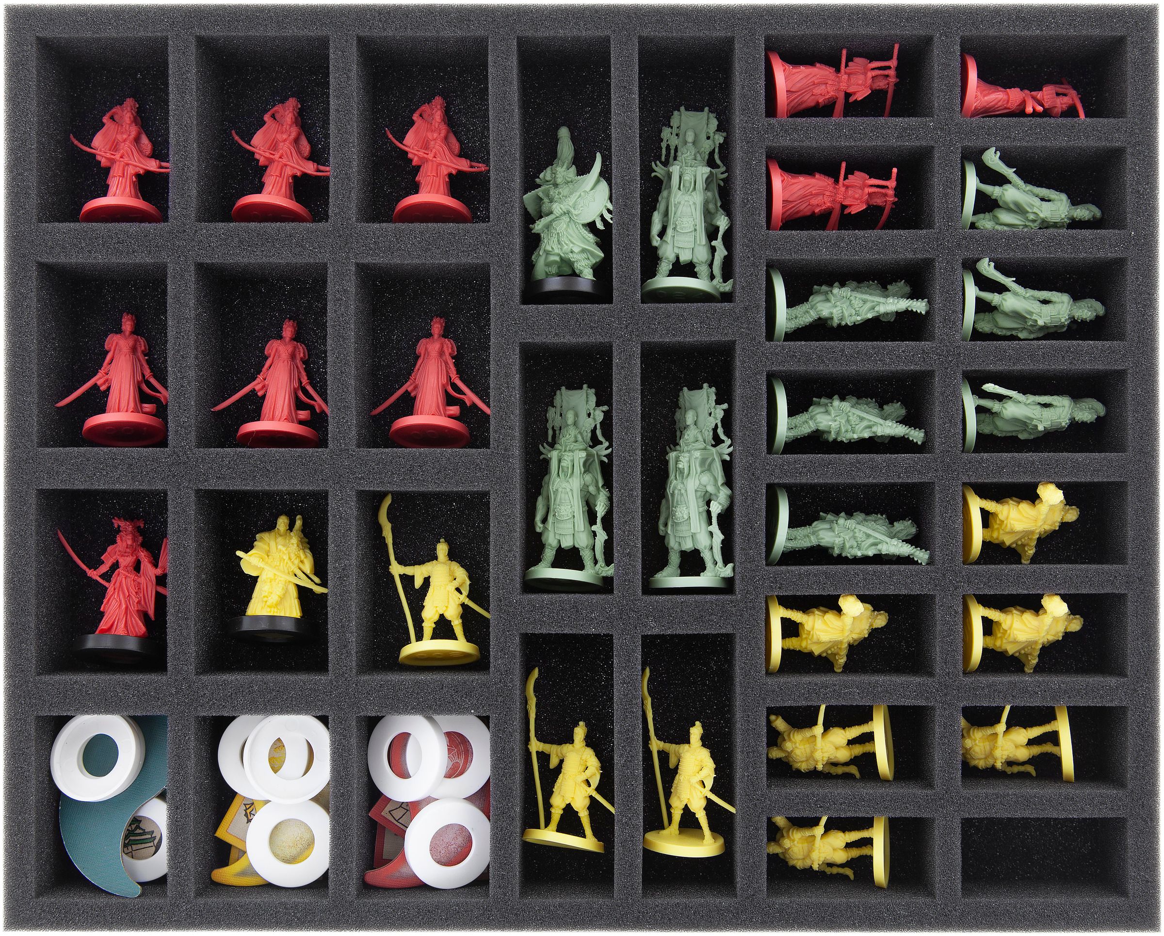 Our foam kit for the complete Rising Sun Kickstarter Pledge solves all your problems. The set consists of two large storage boxes and eight foam trays. The foam trays with their custom cut compartments will hold each and every game component of both the Core Box and all Stretch Goals of the Kickstarter campaign (Daimyo, Dynasty Invasion, Monster Pack and Kami Unbound expansions). Included in the set is also a nap foam to cover the board in the one storage box and a foam topper to cover game material in the other.